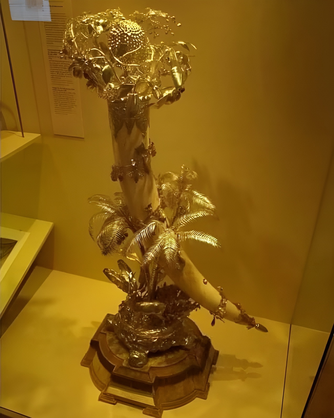 The tusk was adorned with carvings of tropical flowers and fruits native to the Indies, evoking the image of a towering “horn of plenty” rising from a rocky base. Surrounding it, delicate engravings of local deer added an exotic touch. The base and other decorative elements were exquisitely crafted from heavy silver, plated with vermeil (gilded silver), creating a shimmering play of colors.
