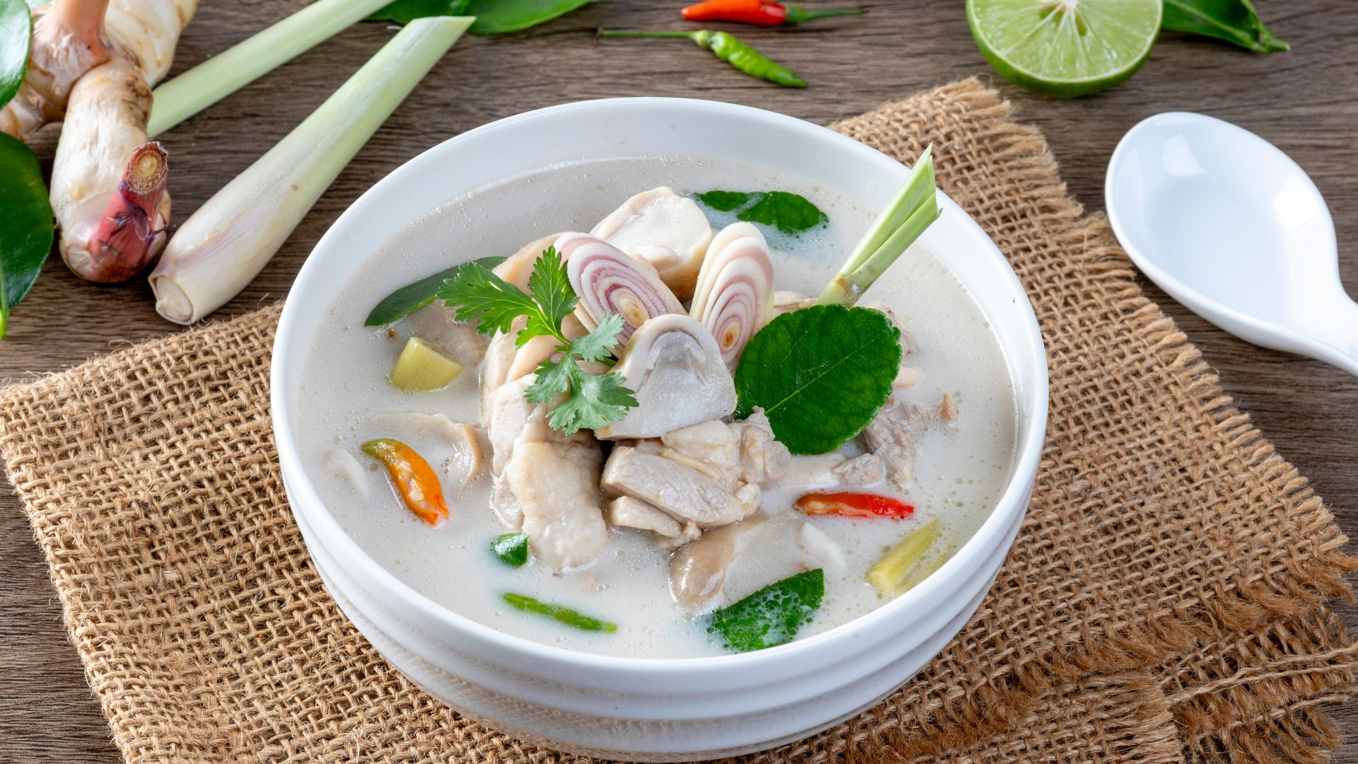 Tom Kha Gai is a coconut milk chicken soup flavored with galangal, offering a savory and refreshing taste with a subtle hint of spice. The sharp aroma of galangal blends smoothly with the creamy coconut milk, creating a distinctive flavor typical of Central Thailand. It’s also known for its soothing effect on the digestive system.