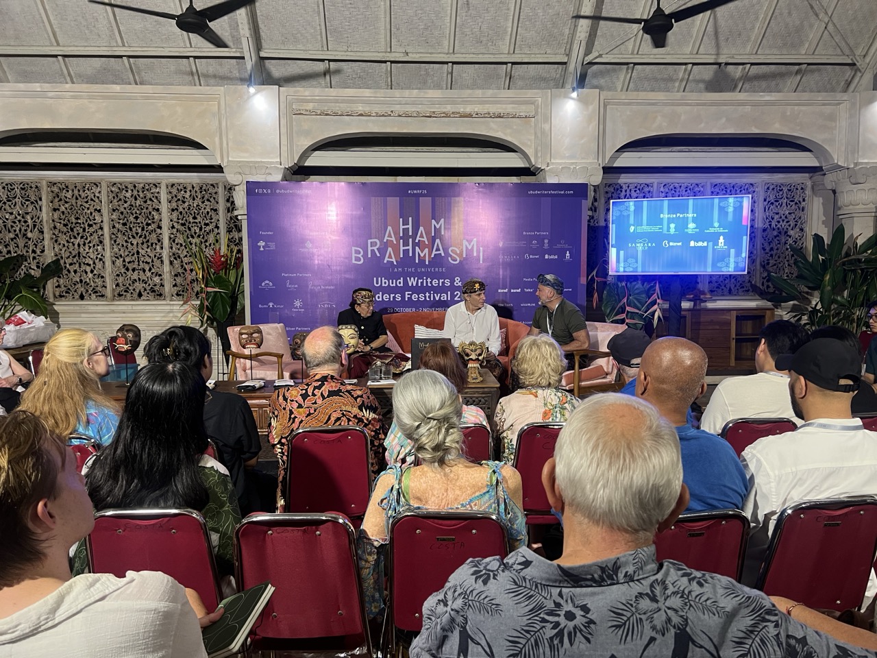 Later in the day, Bello Li and Wayan Wardika led “Discover the Magic of Fireflies Village”, a sunset journey through rice paddies and Balinese folklore. The evening’s historical highlight, “History Duet: Cosmos and Kingdom,” paired David Van Reybrouck and Herold van der Linde at Honeymoon Garden, while the late-night reflection “What Do We Do Now” at Luma Cucina featured Banu Mushtaq, Faisal Tehrani, and Steph Hormann, closing the night on a note of hope and urgency.