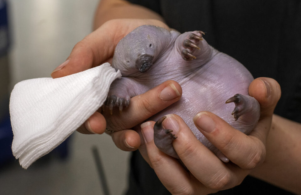 This baby—called a puggle—is born hairless and spineless, spending the first several months of its life inside its mother’s pouch until strong enough to venture out.