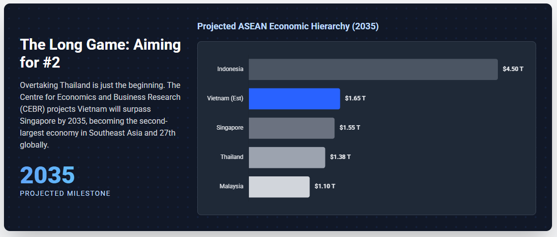 While overtaking Thailand is the headline for 2026, Vietnam has even bigger goals. Most long-term forecasts project that Vietnam will surpass Singapore by 2035. This includes the latest World Economic League Table from the CEBR. At that point, Vietnam is expected to become the second-largest economy in Southeast Asia. It is projected to become the 27th largest in the world.
