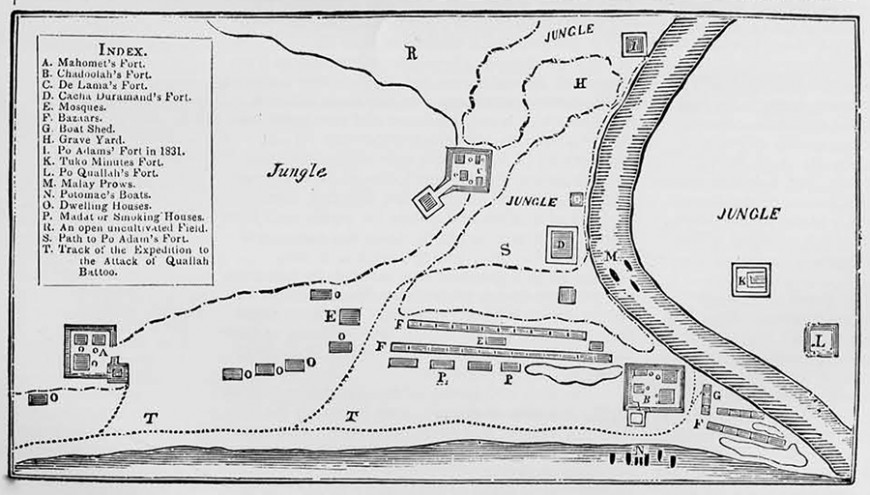 After rounding the Cape of Good Hope and linking up with the Pacific Squadron in Ceylon, Potomac arrived off the coast of Kuala Batu on 5 February 1832. Downes first met with Po Adam, who informed him that the uleëbalang (local chiefs) refused to pay compensation for the attack on the Friendship.