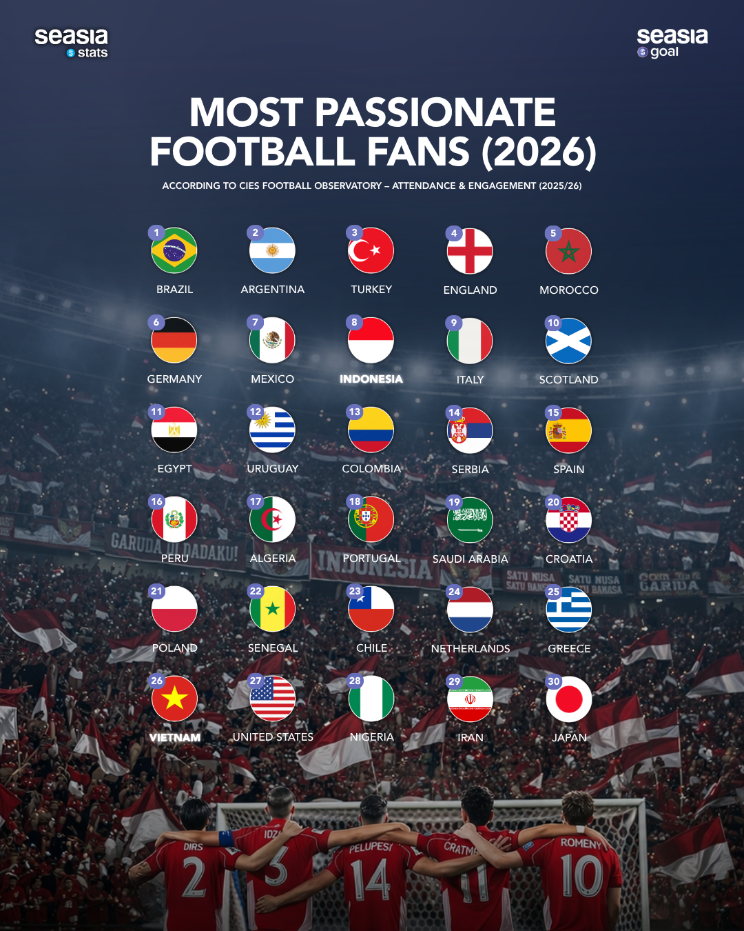 According to the latest report from CIES Football Observatory, which released its Attendance & Engagement Report (2025/26), the list of the 30 most passionate football nations in the world is dominated by familiar giants.