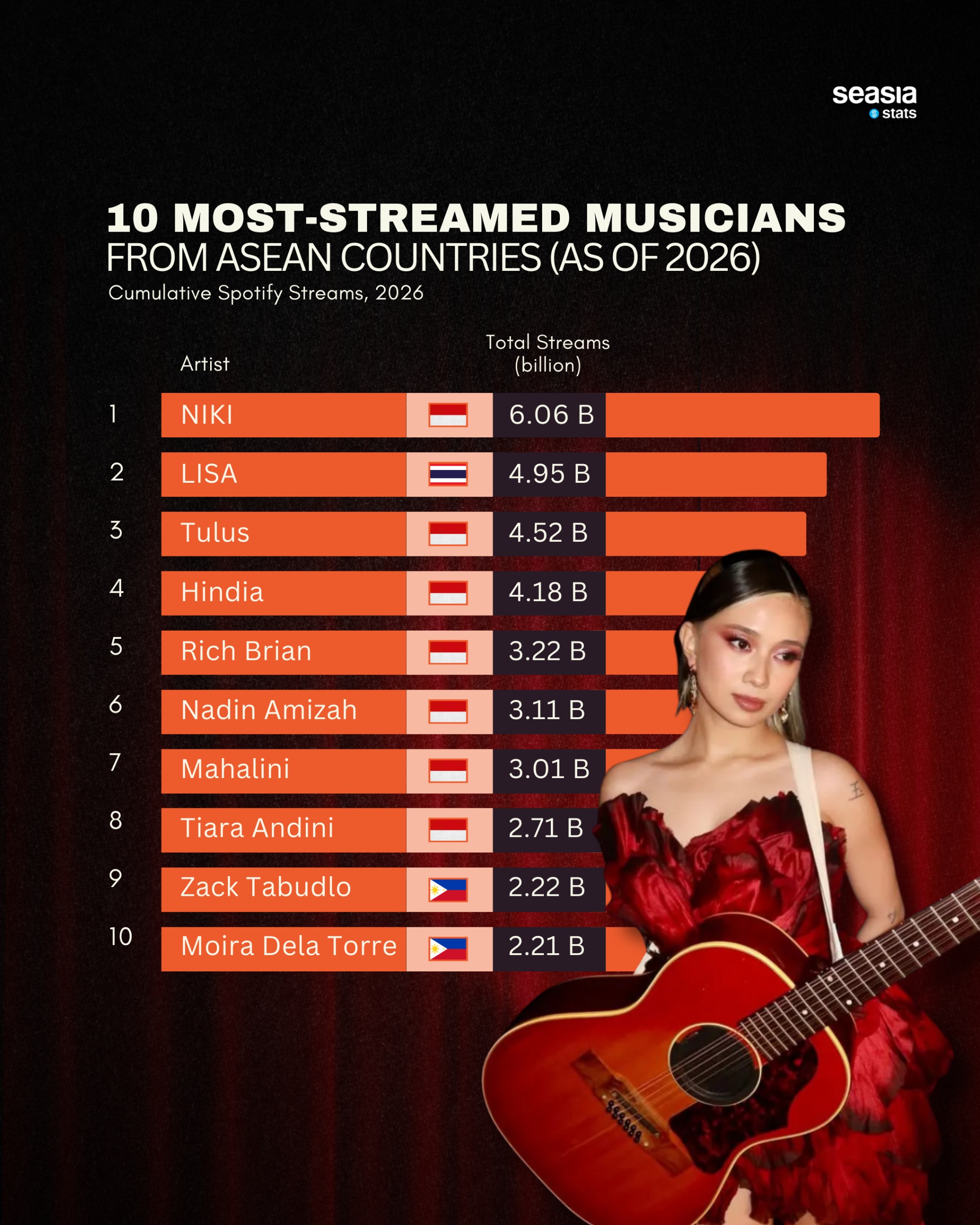 In the digital music era, streaming platforms have transformed how artists build global audiences. Today, a song released in Jakarta, Manila, or Bangkok can instantly reach listeners around the world. Spotify, in particular, has become a powerful stage for Southeast Asian musicians, allowing regional talent to compete alongside global stars. According to data compiled by Seasia Stats as of early 2026, the ASEAN music scene is thriving, with a new generation of artists accumulating billions of streams and gaining international recognition.