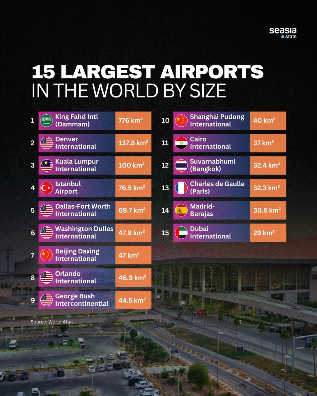 Rounding out the top three is Istanbul Airport in Turkey, which occupies 100 km². These three airports represent the pinnacle of aviation infrastructure, offering vast spaces that dwarf their international competitors. (Note: While the image shows a typo in the rank for Kuala Lumpur, Istanbul Airport holds the third-largest land area at 100 km²).