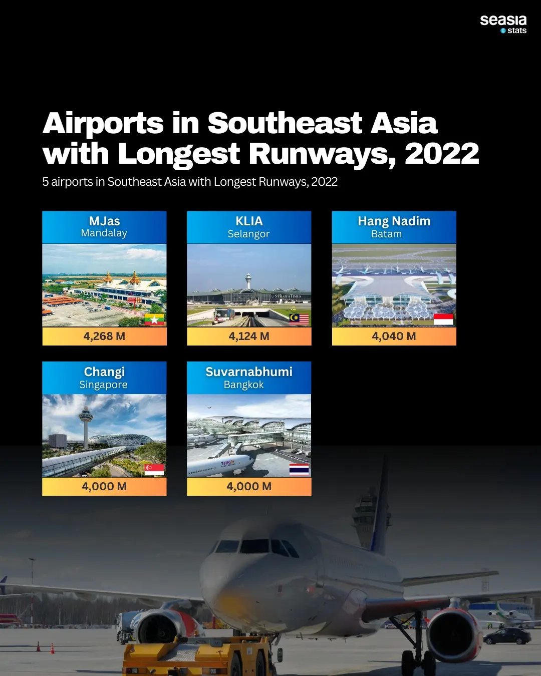 Leading the list is Mandalay International Airport, located 35 km south of Mandalay in Tada-U, Myanmar, boasting the longest runway in the region at 4,268 meters.