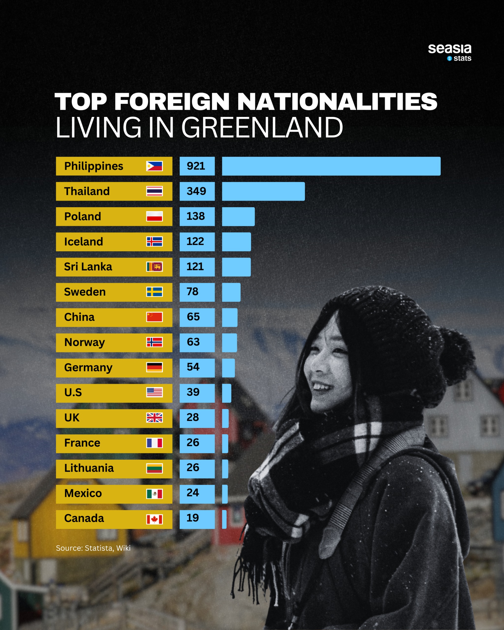 Topping the list by a wide margin are residents from the Philippines, with 921 people living in Greenland. This makes Filipinos the largest non-native nationality in the territory by a significant margin.