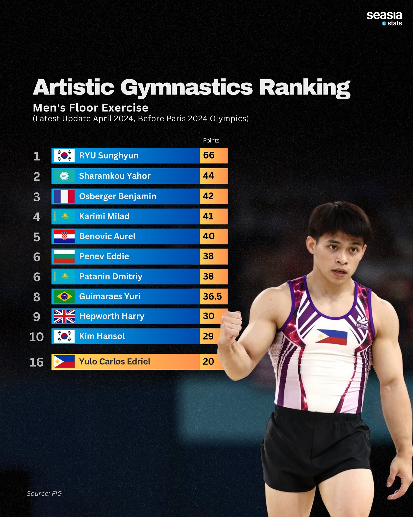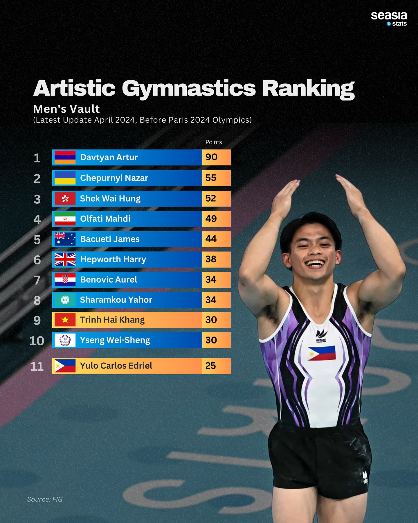 As of April 2024, during the World Cup 2024 - Qualifying OG 2024 in Doha, Seasia Stats will feature the top 10 rankings for the Floor Exercise and Vault categories. With Yulo’s recent success, gymnastics enthusiasts are eagerly anticipating his updated rankings, expecting a significant leap from his previous standings.