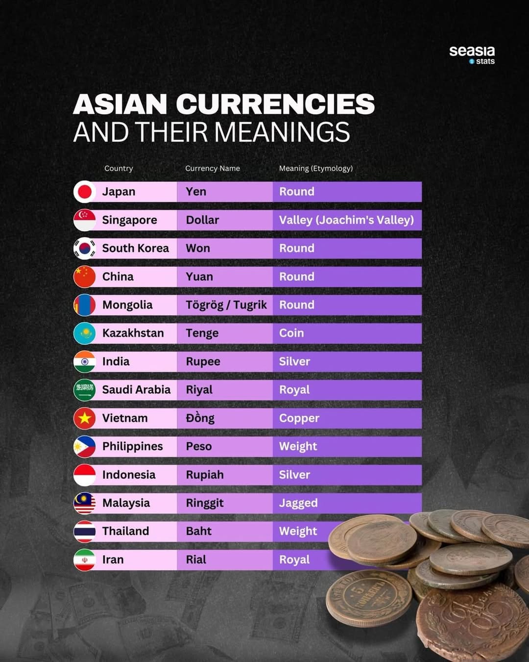 Beyond coin shape, many currency names are closely linked to the physical value of metals or standardized measurements. The Indian Rupee and Indonesian Rupiah both mean “silver,” highlighting the importance of silver in early trade and minting practices. Vietnam’s Đồng, which translates to “copper,” also reflects the material basis of its historical currency. Meanwhile, the Philippine Peso and Thai Baht derive from terms meaning “weight,” emphasizing their origins as units of measurement rather than abstract value.