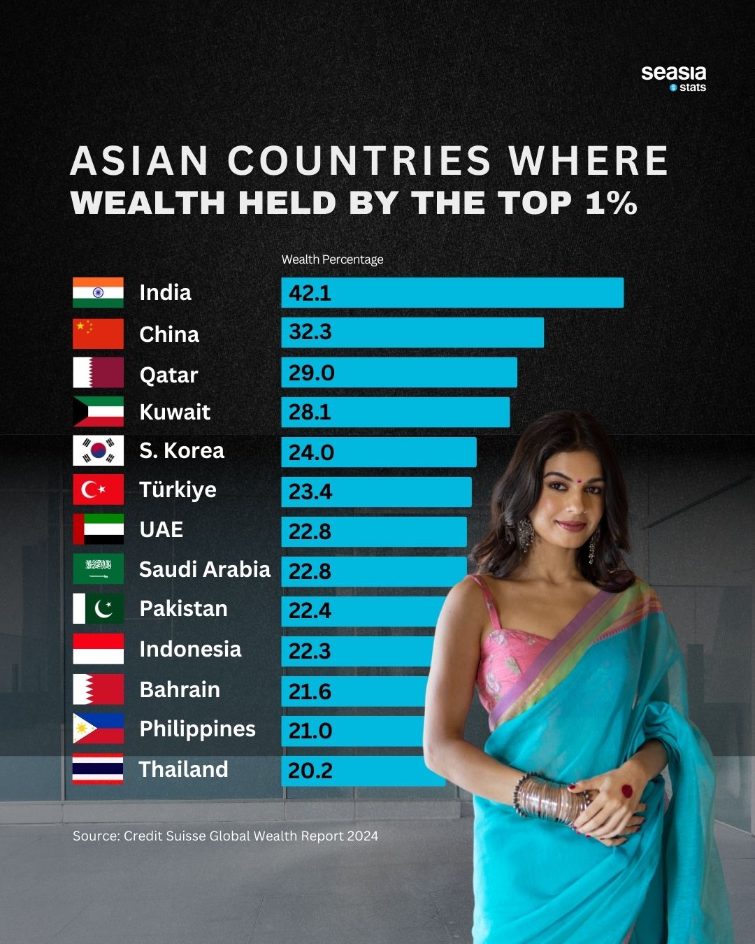 India leads the region, with 42.1% of national wealth held by its top 1%. This stark concentration reflects a growing gap between the ultra-rich and the rest of the population. While India’s tech-driven economy and startup ecosystem have created billionaires, millions still struggle with basic access to health, education, and employment.