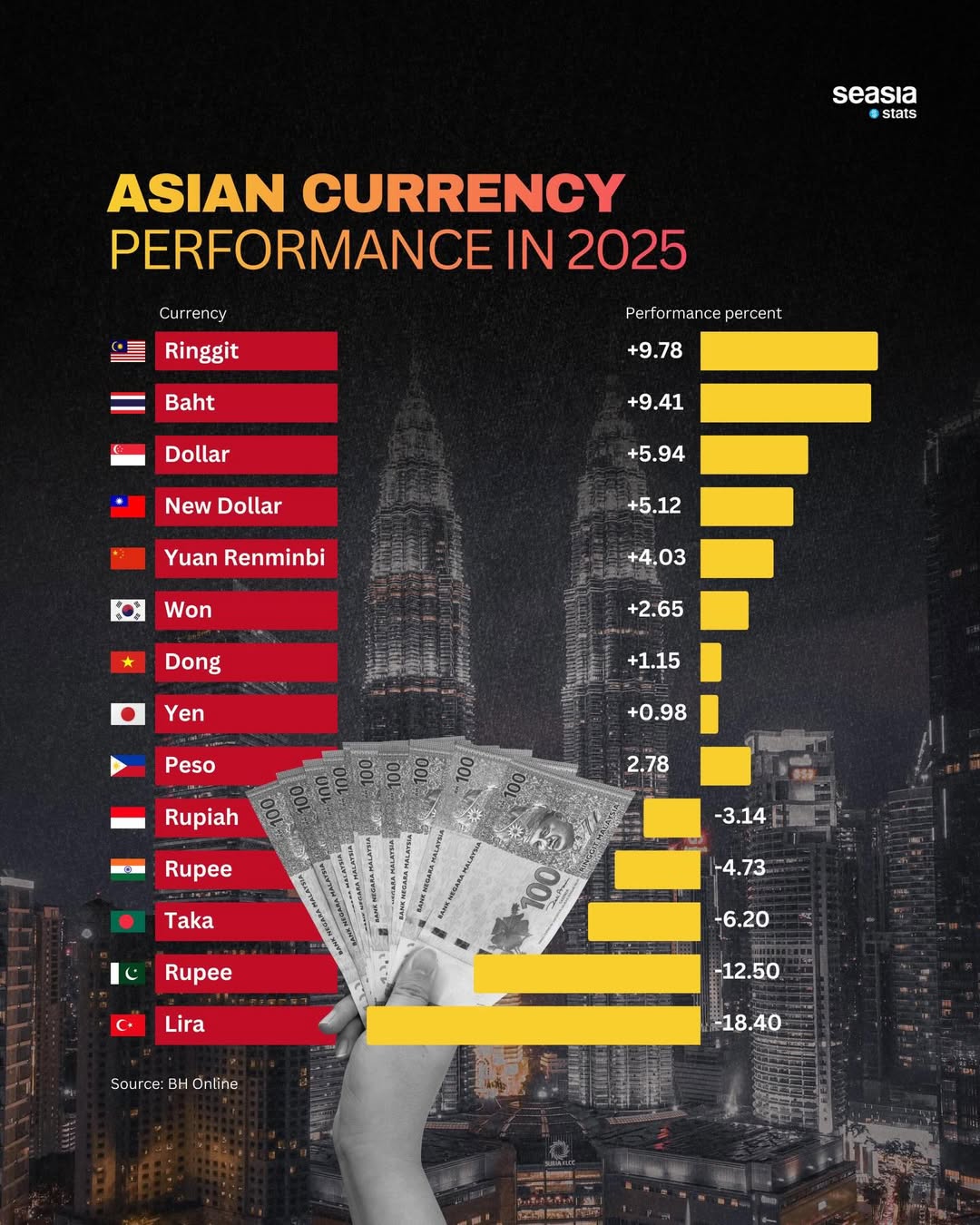 Close behind is the Thai Baht, which gained +9.41%, marking a strong recovery driven by tourism revival and stabilizing macroeconomic fundamentals. In third place, the Singapore Dollar recorded a solid +5.94%, underscoring Singapore’s reputation as a regional safe haven supported by prudent monetary policy and financial stability.