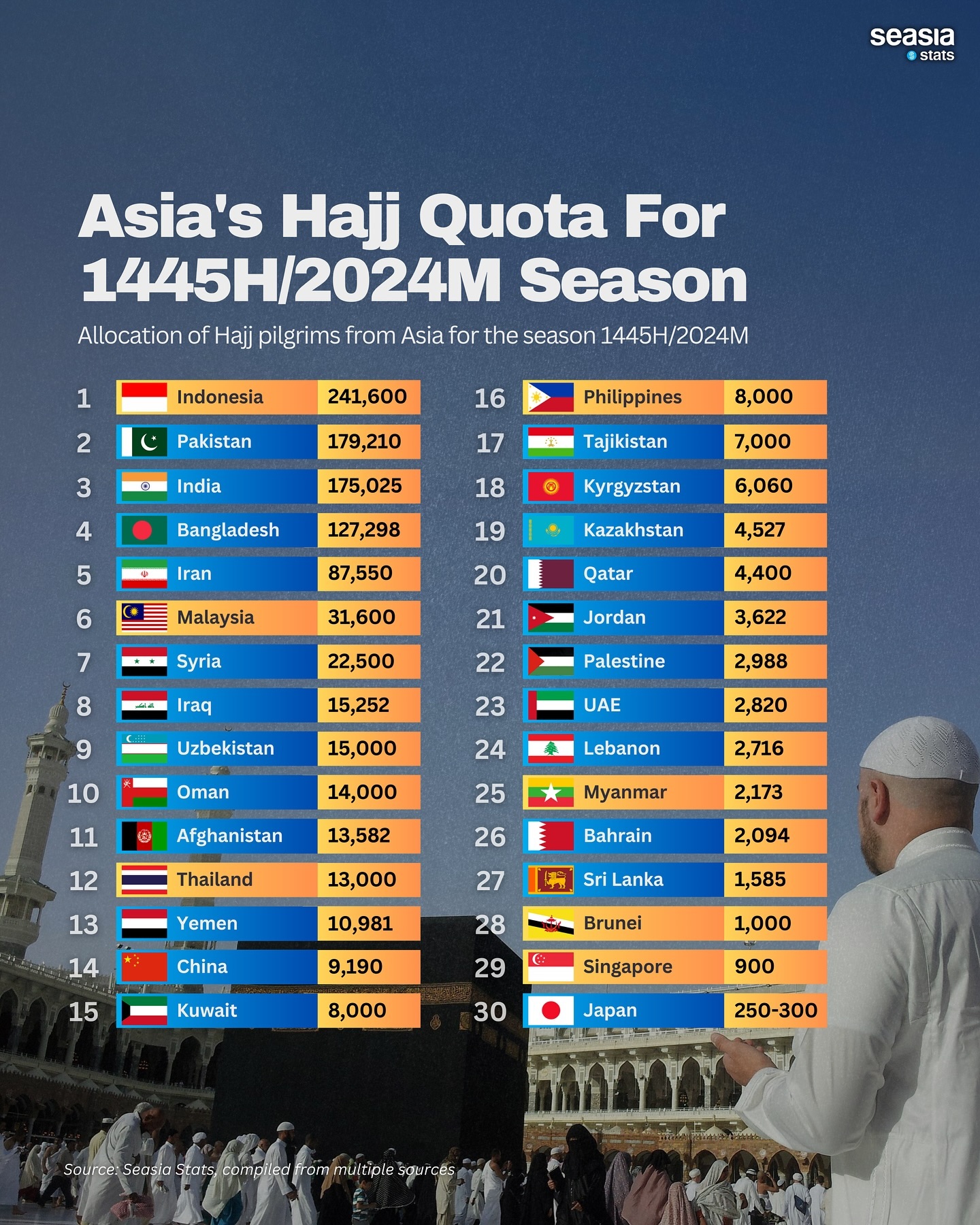 For the upcoming Hajj season of 1445H/2024M, Indonesia has secured the distinction of having the largest allocation of Hajj quotas among all countries in Asia. According to data compiled by Seasia Stats, Indonesia's allocation stands at an impressive 241,600 quotas, reaffirming its status as a key participant in the annual pilgrimage.