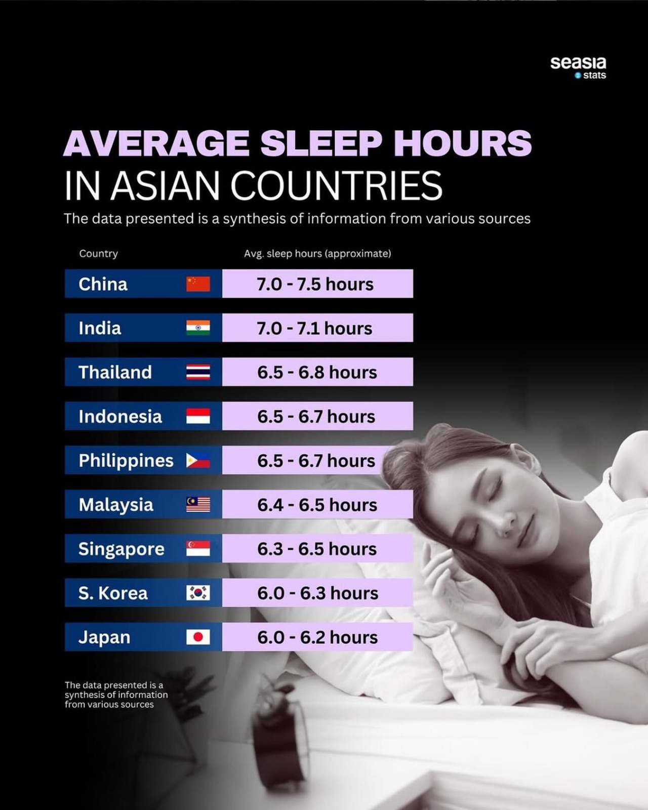 Based on the infographic compiled by Seasia Stats, China and India sit at the top of this list for average sleep duration, with China estimated at 7.0 to 7.5 hours and India at 7.0 to 7.1 hours per night. That places both countries closest to the commonly recommended adult sleep range of around seven or more hours.