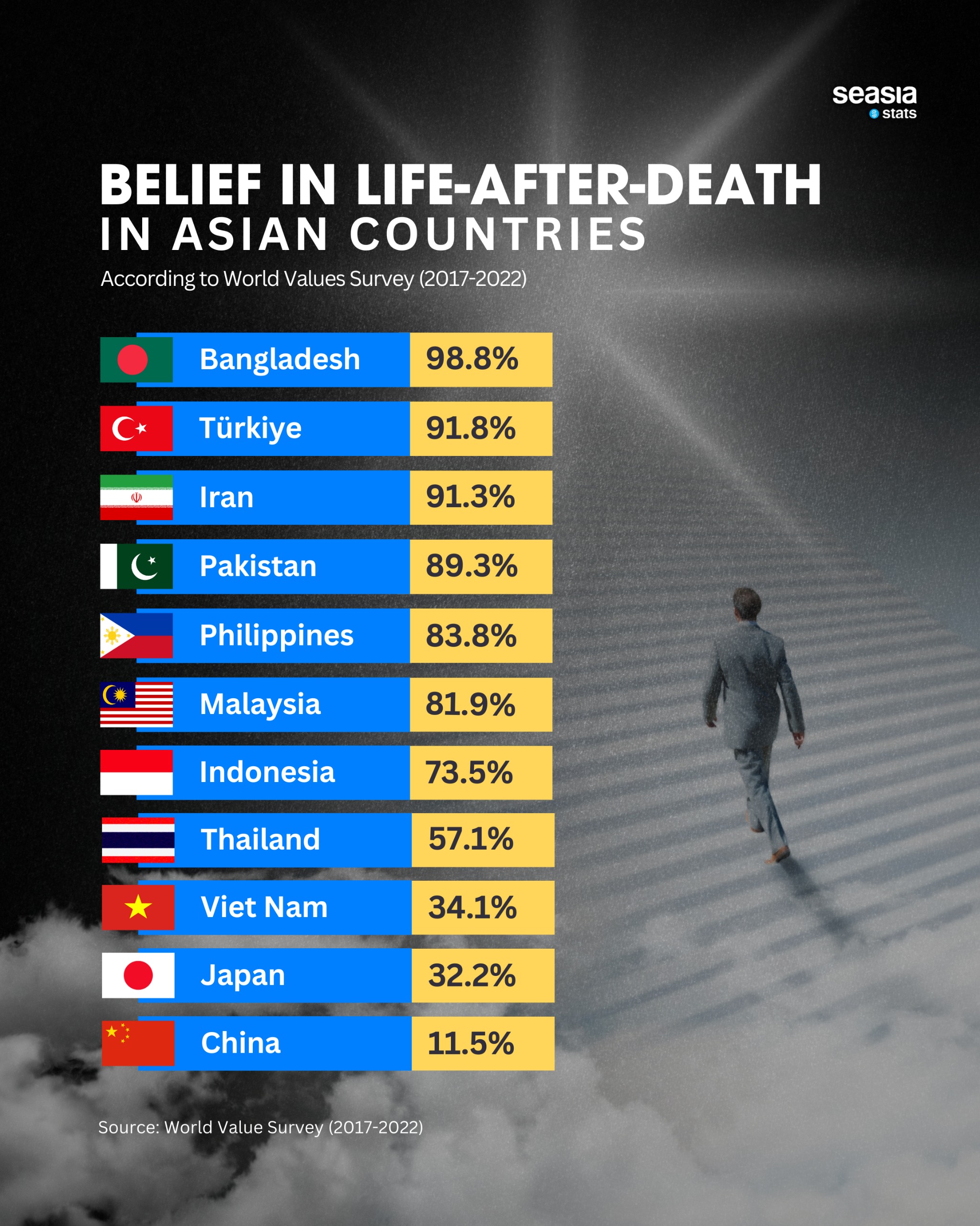 There’s a sharp decline in belief in life after death in Viet Nam (34.1%) and Japan (32.2%), where secularism, cultural nuances, and philosophical traditions like Confucianism and Shintoism shape how people view life and death.