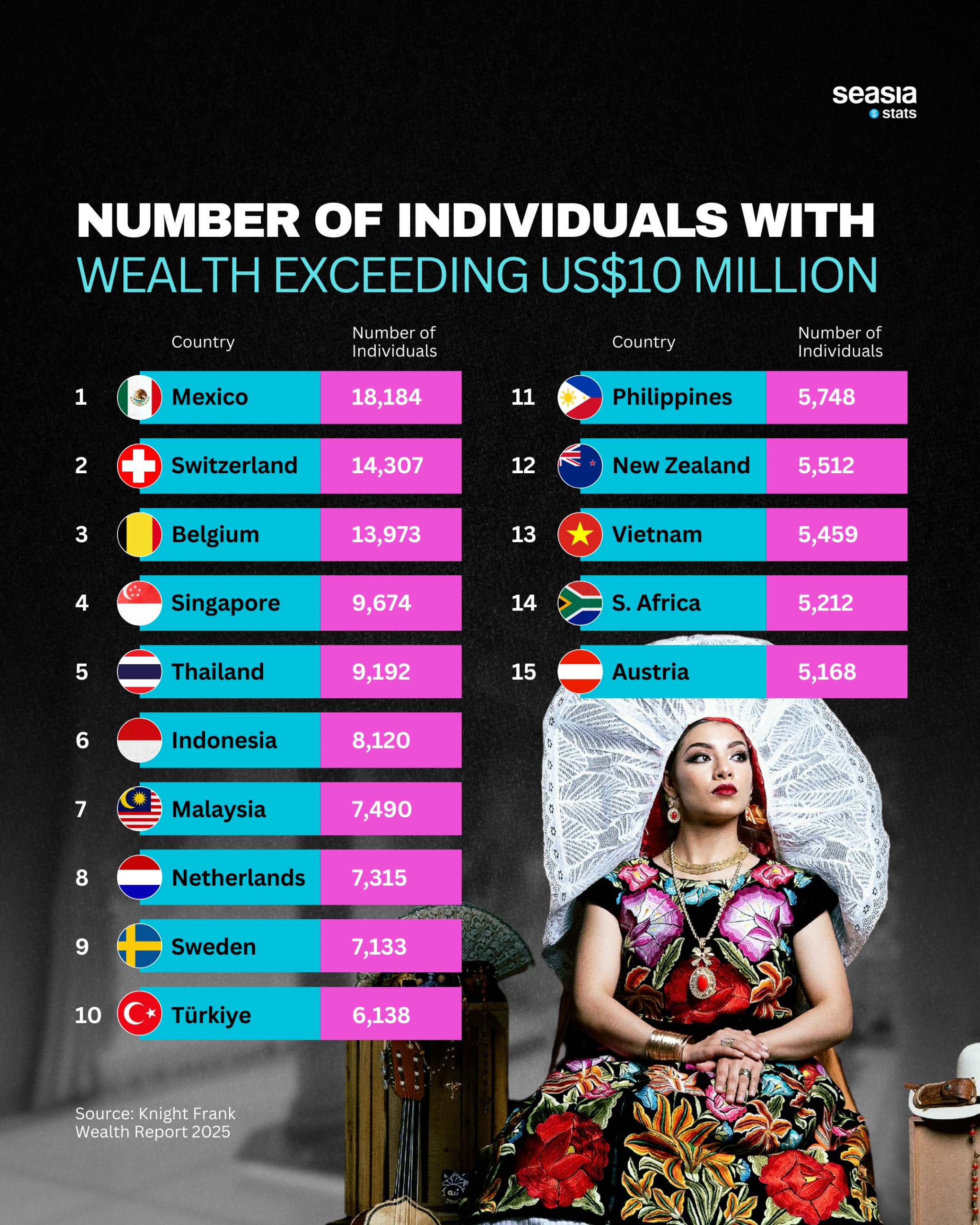 Topping the global ranking is Mexico, with 18,184 individuals holding wealth above US$10 million. Its position reflects a combination of industrial expansion, cross-border trade advantages, and strong family-owned conglomerates.