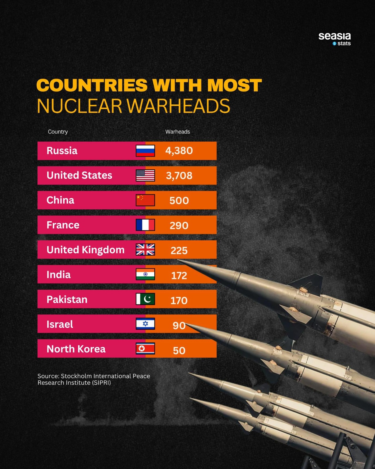 China holds the third-largest nuclear arsenal, currently estimated at around 500 warheads in the ranking presented by Seasia Stats. However, several international research organizations estimate that the country’s stockpile has grown to approximately 600 warheads as of 2025.