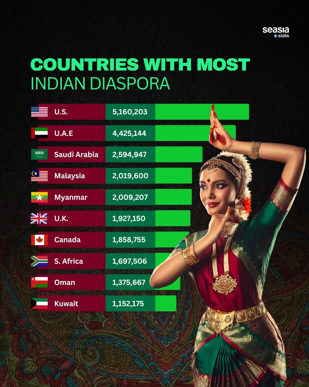 Coming in at second is the United Arab Emirates (U.A.E.), with 4,425,144 people of Indian descent. This significant population reflects India's long-standing labor migration relationship with the Gulf. Indian workers in the U.A.E. span various sectors — from construction and retail to finance and medicine.