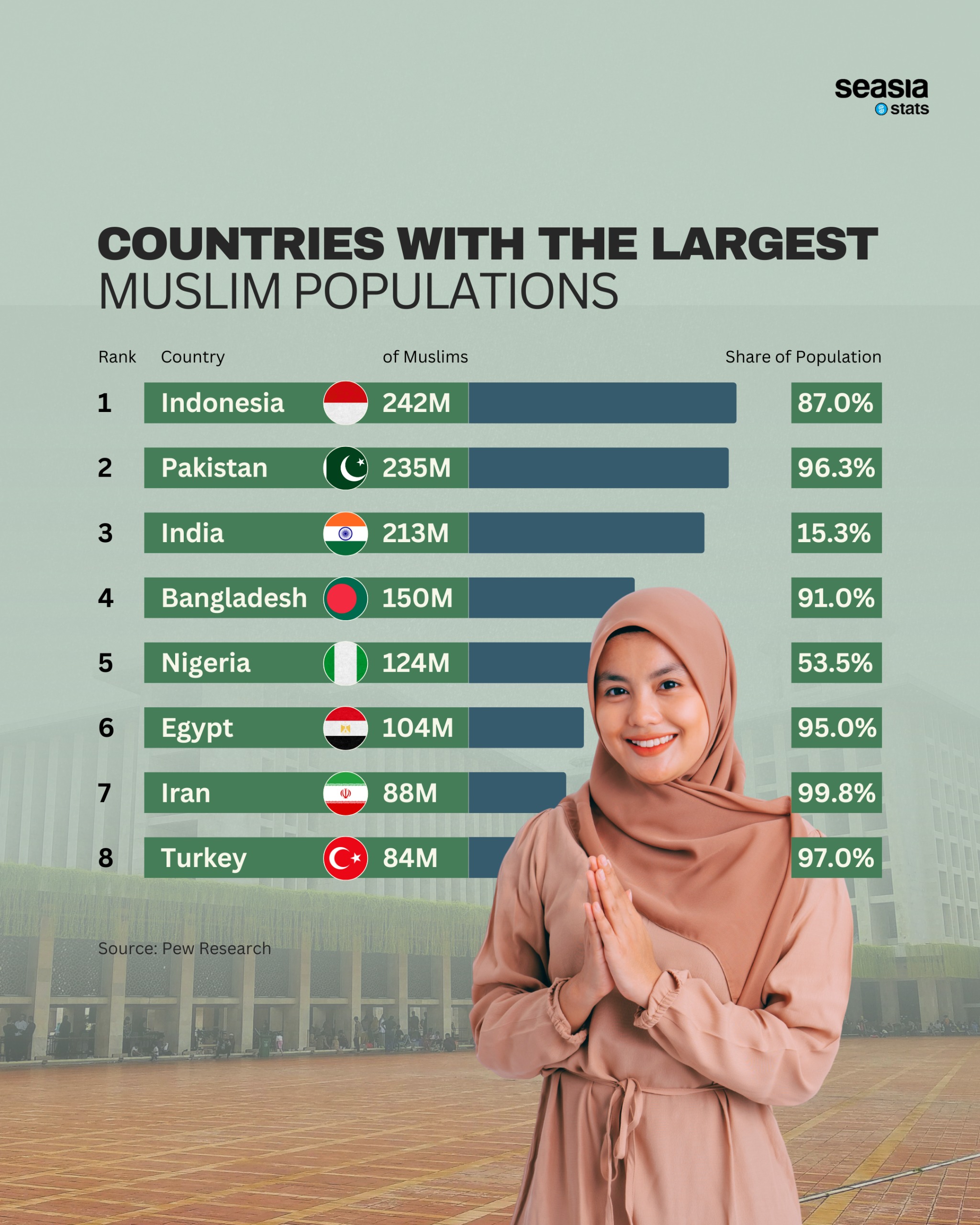Indonesia continues to hold its long-standing position as the country with the largest Muslim population in the world. With an estimated 242 million Muslims, the faith represents about 87% of the national population. From Aceh to Java and beyond, Islam is deeply woven into daily life, local traditions, and national identity.