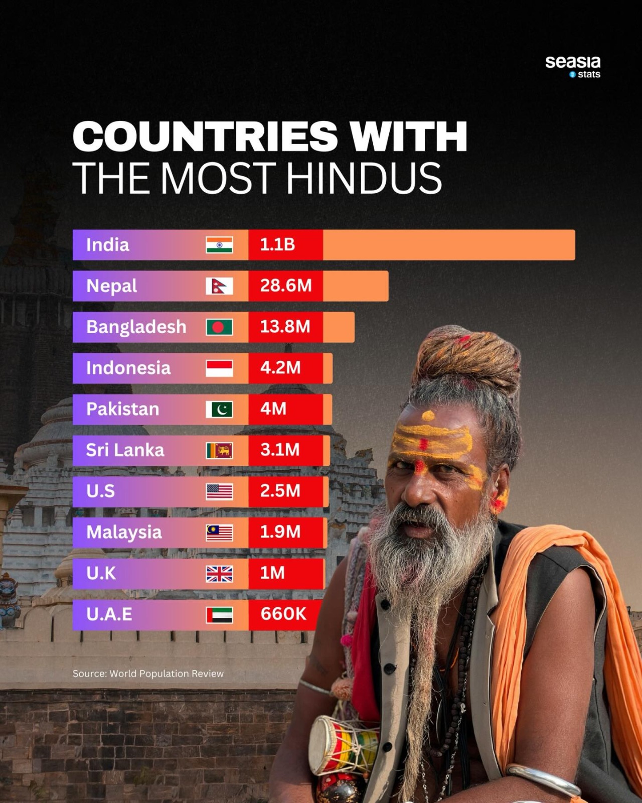 Across continents and cultures, Hinduism continues to shape communities, traditions, and identities on a remarkable global scale. With an estimated 1.2 billion followers worldwide, it stands as the world’s third-largest religion—deeply rooted in South Asia yet increasingly visible across Southeast Asia and the global diaspora. Recent figures from Seasia Stats and World Population Review highlight where Hindu communities are most concentrated and how their presence continues to evolve in the modern world.