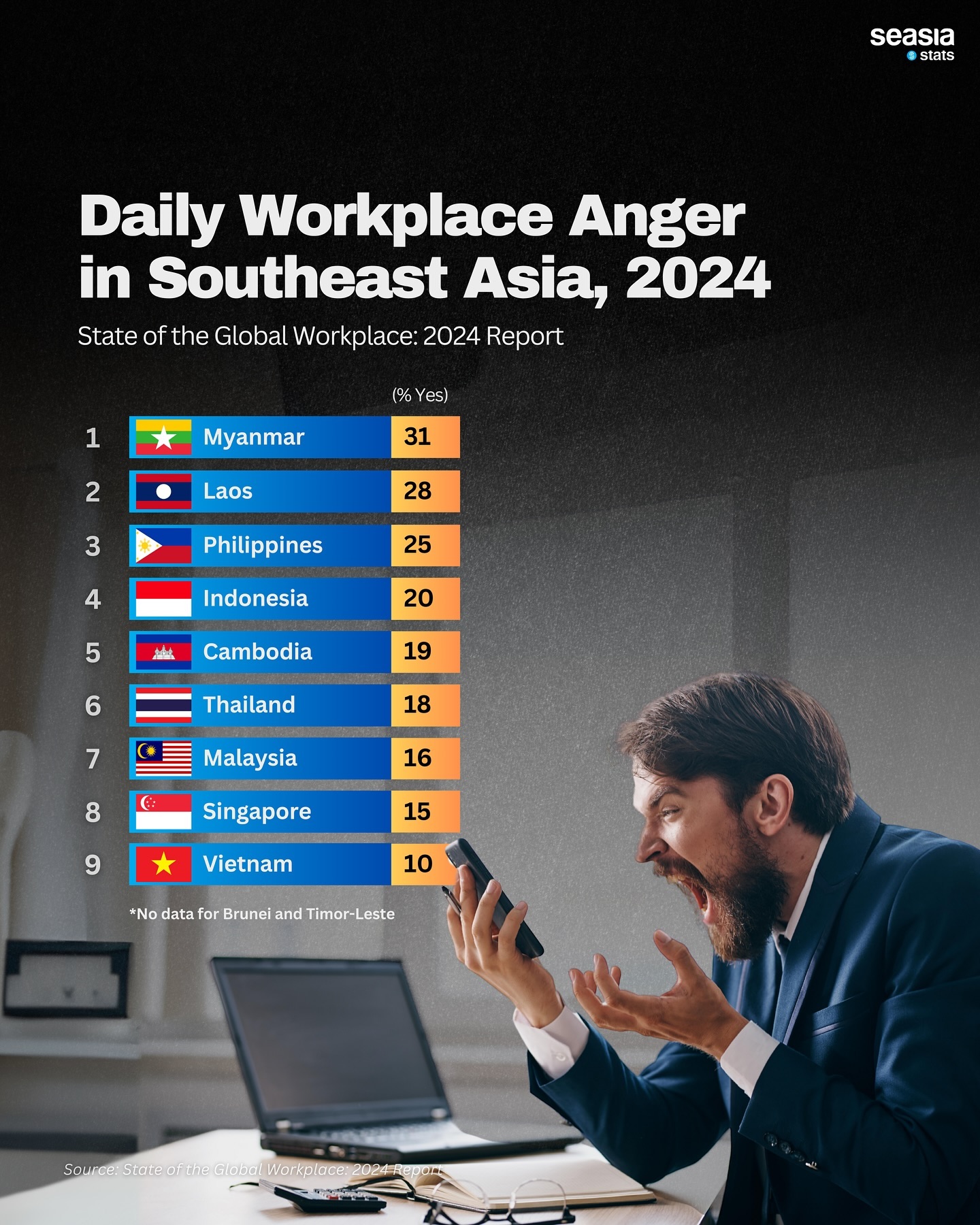 In 2024, Myanmar has been reported to have the highest levels of daily worker anger in Southeast Asia, according to the 'State of the Global Workplace: 2024 Report' by Gallup. The survey indicates that 31% of workers in Myanmar experience anger on a daily basis, marking the highest percentage in the region.