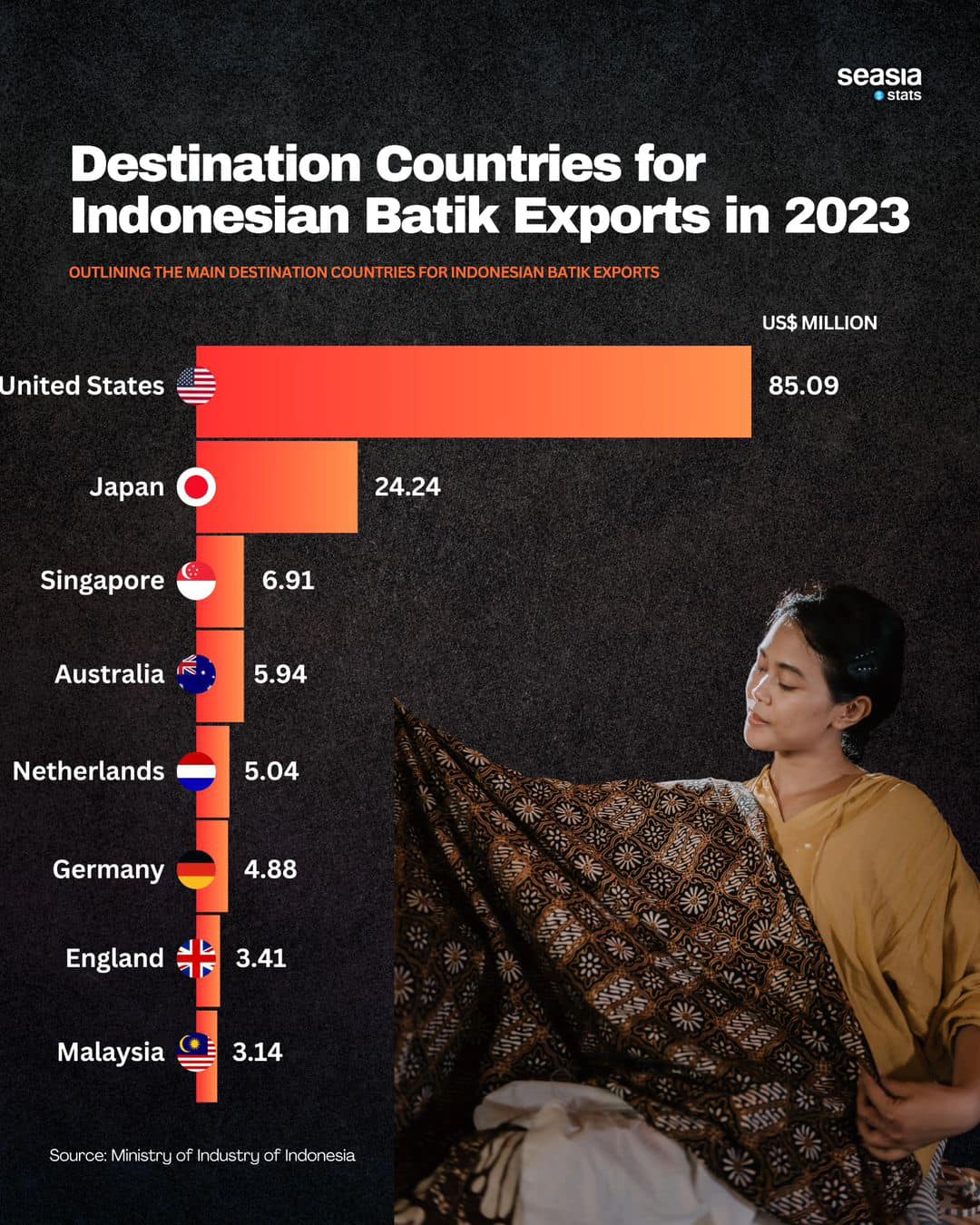 Japan stands as the second-largest market for Indonesian batik, with exports valued at US$24.24 million in 2023. Japan's appreciation for traditional arts and crafts aligns well with the artisanal nature of Indonesian batik. Japanese consumers often value quality craftsmanship, and batik fits into this cultural appreciation, especially in fashion and textile industries. Additionally, trade relations between Indonesia and Japan have fostered a stable market for batik, despite fluctuations in global demand.