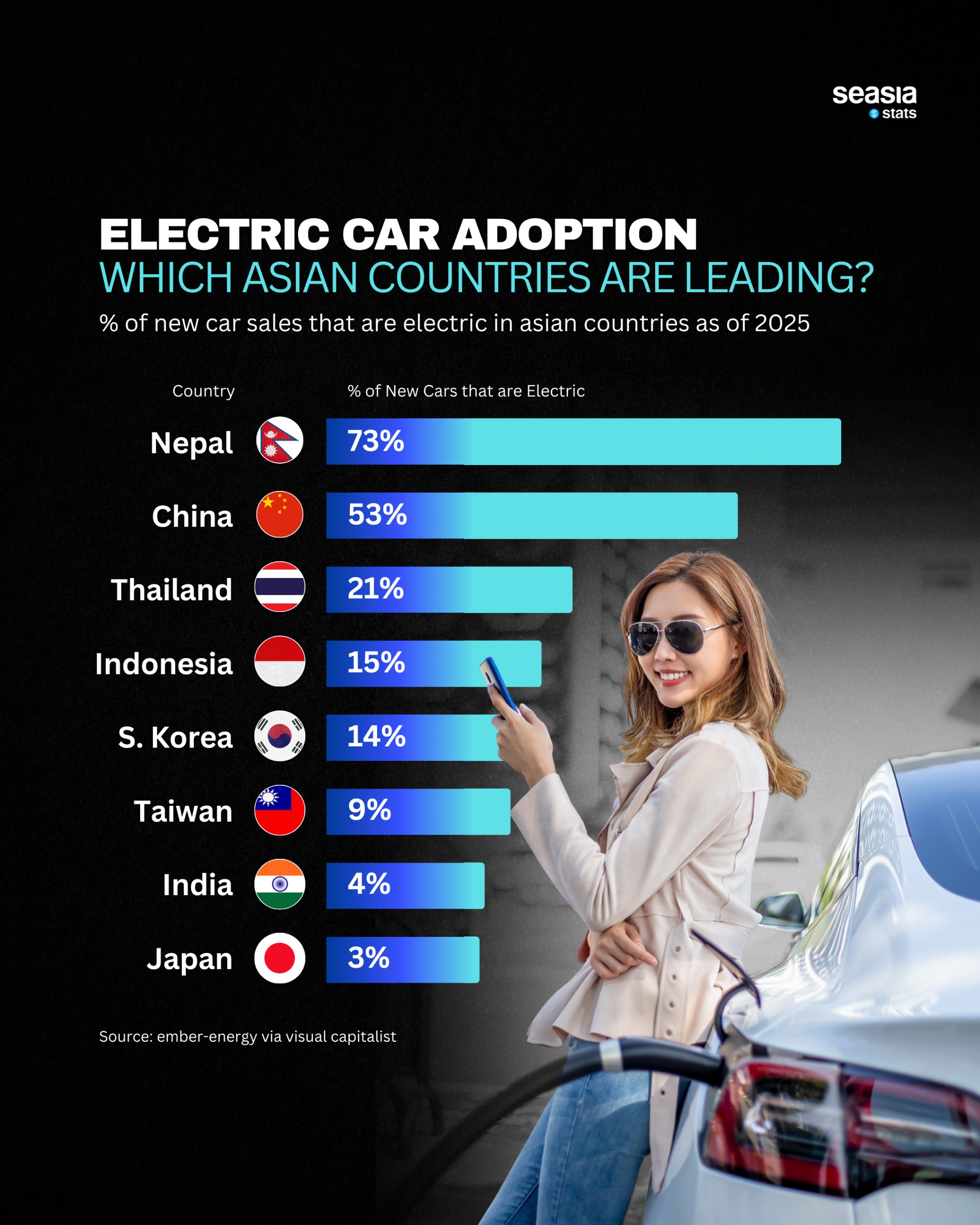 One of the most unexpected leaders in Asia’s EV race is Nepal. According to data from Ember Energy and Visual Capitalist, electric vehicles now account for an astonishing 73% of new car sales in the country. This remarkable shift is driven by Nepal’s abundant, low-cost hydroelectric power and policies that make EV imports far cheaper than fossil-fuel alternatives.