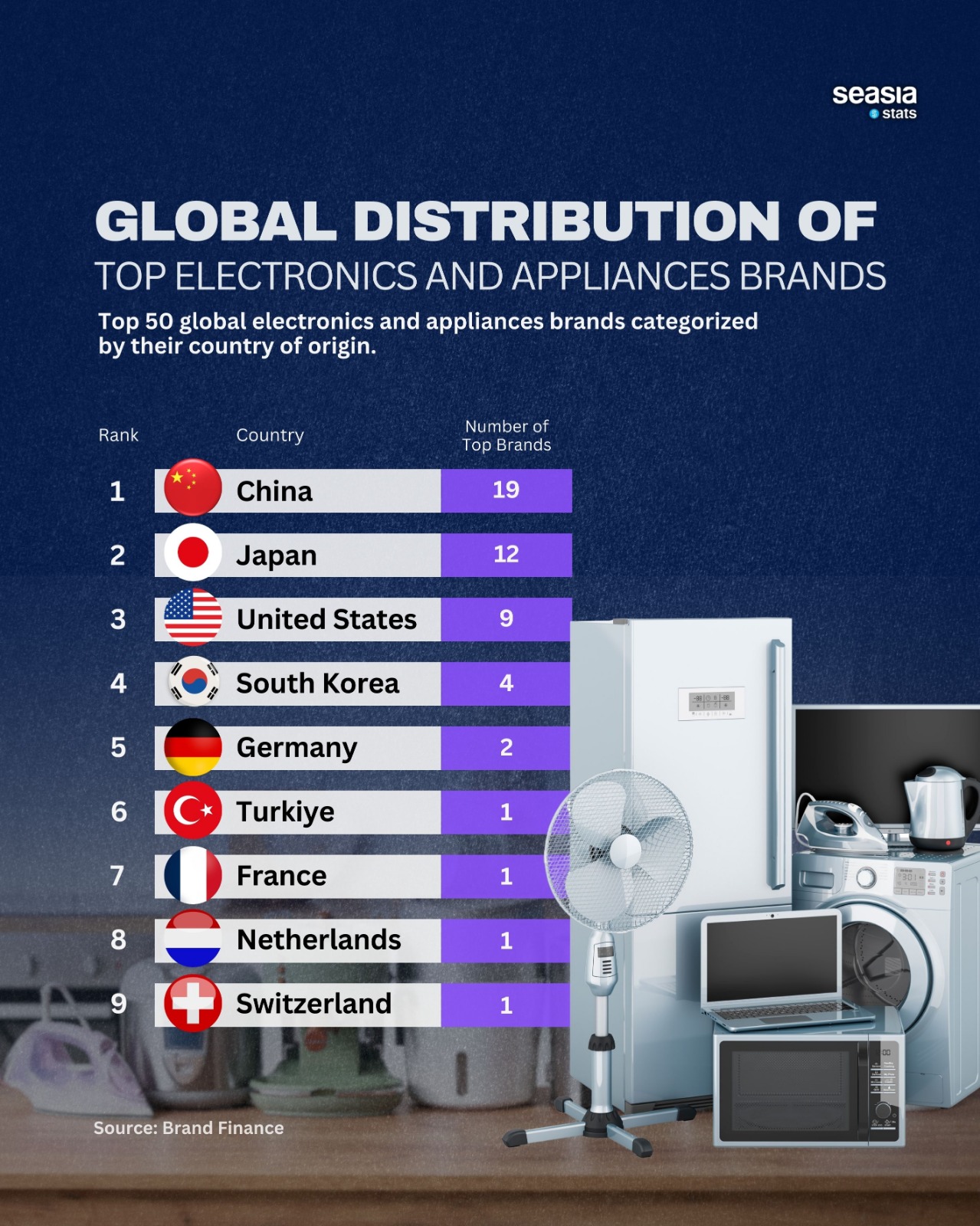 The map of global electronics and appliance brands is no longer just a story about who manufactures the world’s gadgets. It is increasingly about who owns the names, the ecosystems, and the consumer loyalty behind them. The latest Seasia Stats graphic, based on Brand Finance data, shows a striking concentration of power in East Asia—with China far ahead, Japan firmly entrenched, and South Korea still punching above its weight.
