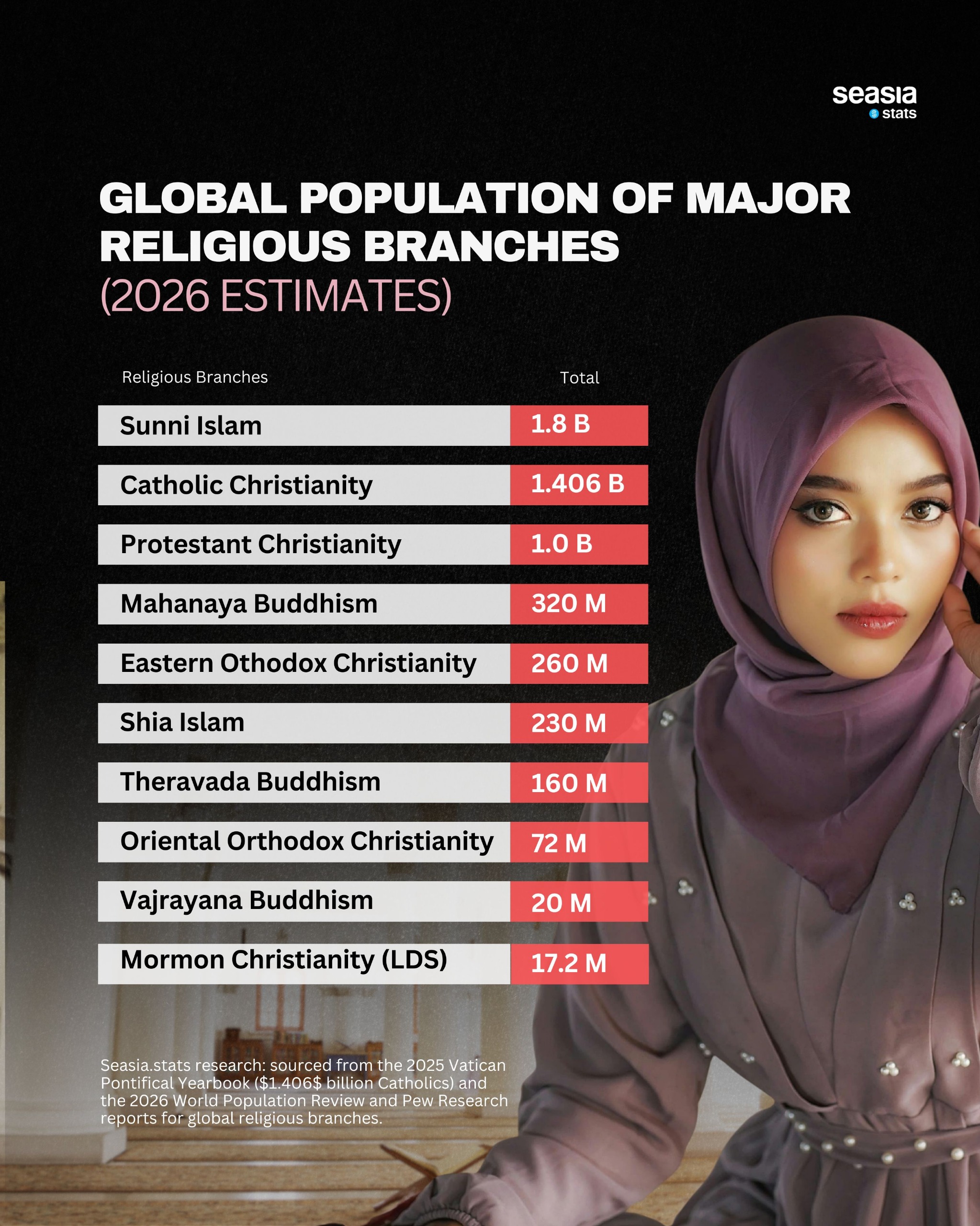 Religion is often discussed in sweeping terms—Islam, Christianity, Buddhism—but the real global picture is far more layered. Within every major faith tradition are branches, schools, and historical communities that have shaped civilizations for centuries. The latest estimates highlighted by Seasia Stats offer a useful reminder that the world’s spiritual map is not only vast, but internally diverse.