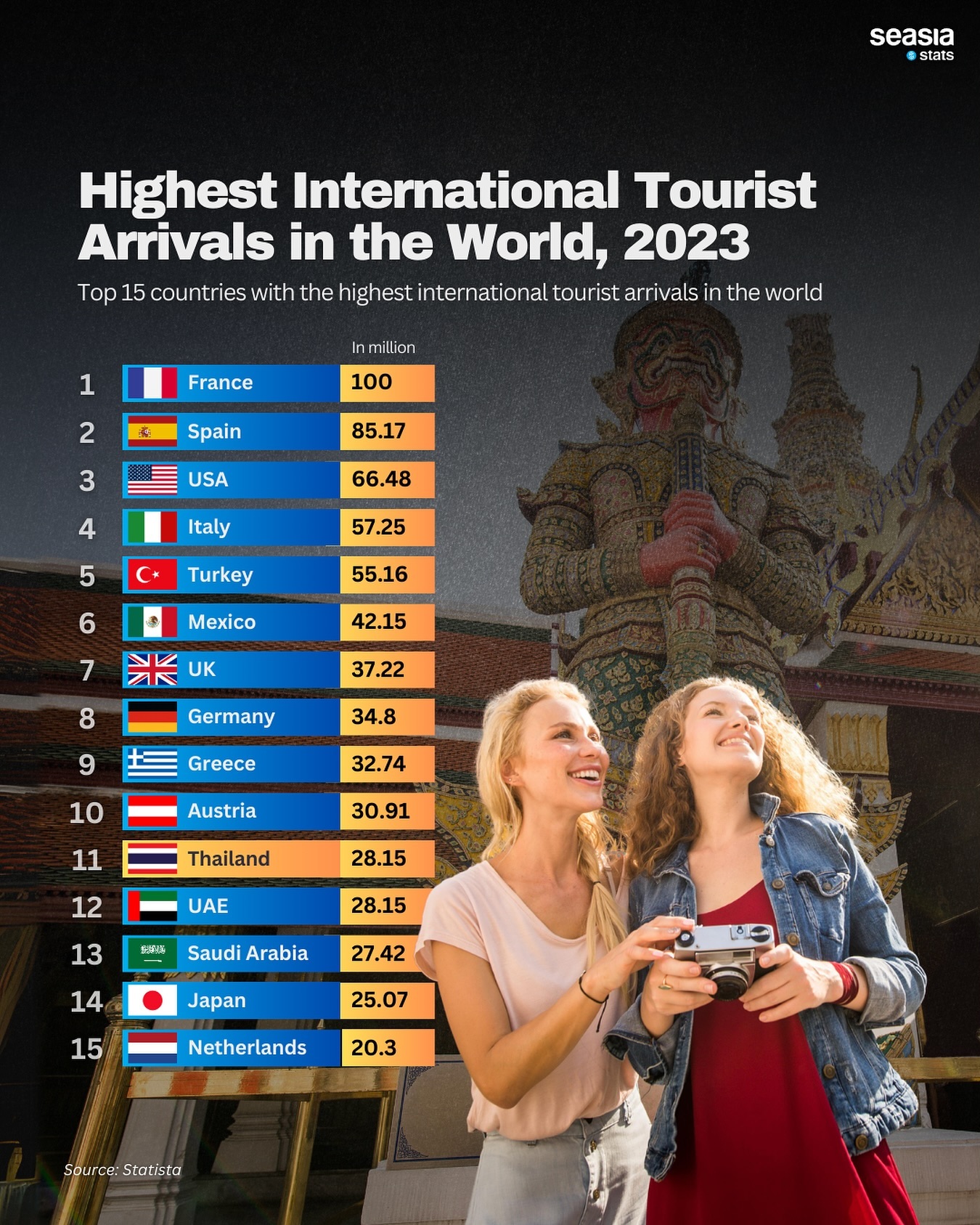 France retained its position as the most visited country in the world, attracting 100 million international tourist visits. Following France were Spain, the United States, and Italy, which held the next positions in the global rankings.