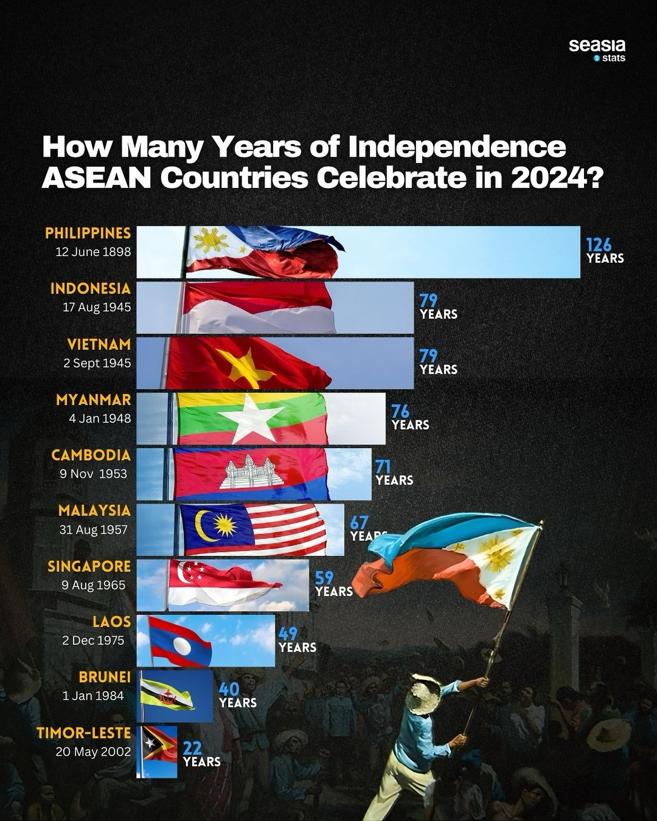 The Philippines is the oldest among the independent nations in Southeast Asia, having declared independence from Spain on June 12, 1898. In 2024, the country marks 126 years of sovereignty, a long-standing history of self-rule that shaped its identity and regional role. Indonesia and Viet Nam follow closely, both celebrating 79 years of independence since their declarations on August 17 and September 2, 1945, respectively. These two nations emerged as key players in Southeast Asia after World War II, when they broke free from colonial rule.