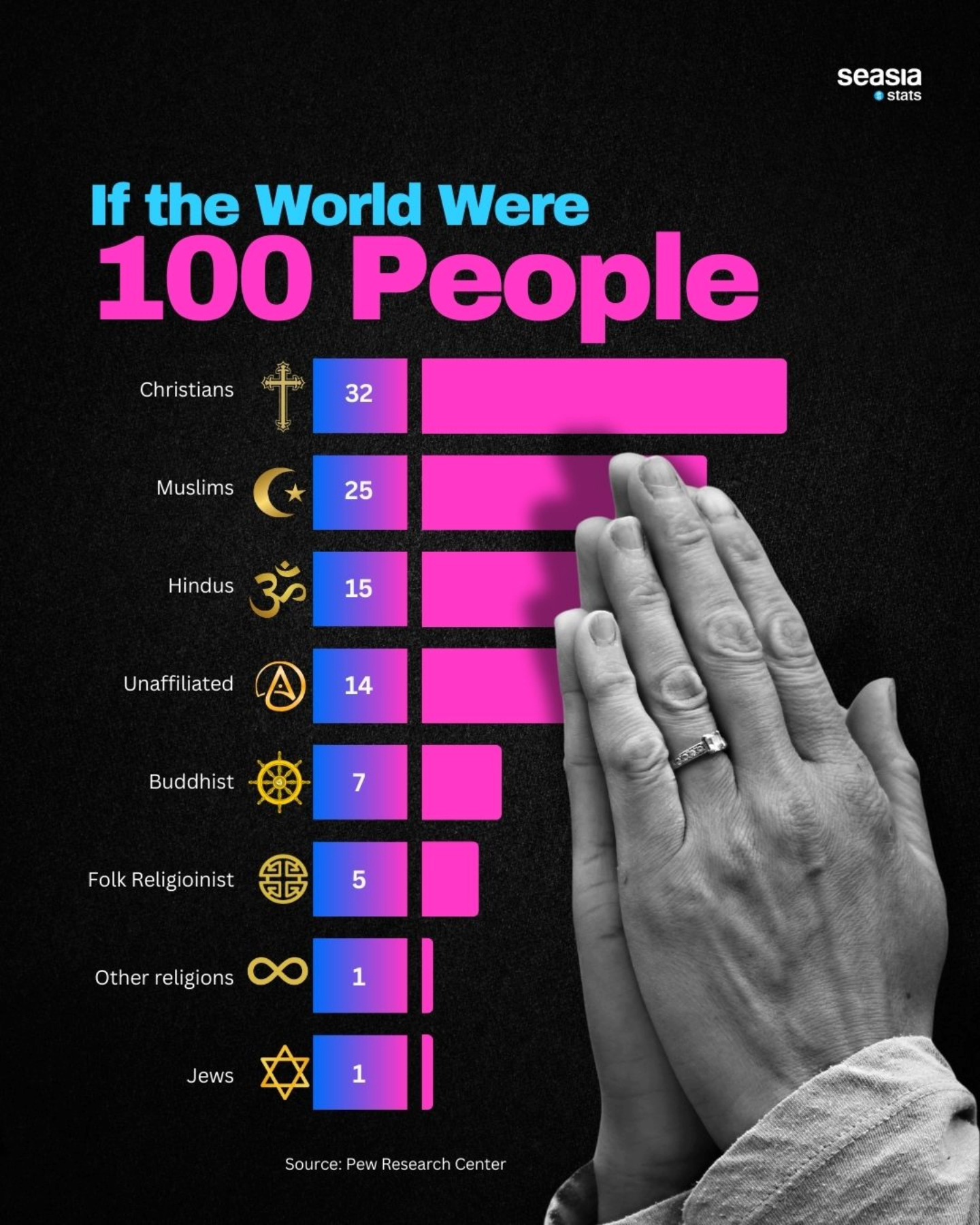 Understanding the religious composition of the world can be challenging due to its vast diversity. However, a simplified model can provide a clear perspective on the relative size of different religious groups globally. Imagine a world with only 100 people—this model, based on data from the Pew Research Center, allows us to visualize the distribution of major religions in a more accessible way.