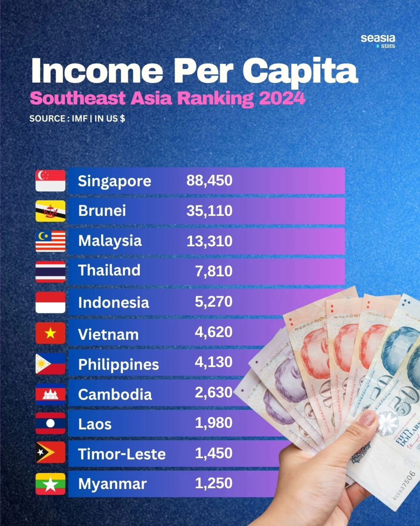 Several other Southeast Asian countries fall within the middle-income range, with Thailand at US$7,810, Indonesia at US$5,270, and Viet Nam at US$4,620. These economies have shown steady growth in recent years, driven by industrialization, exports, and increasing domestic consumption.
