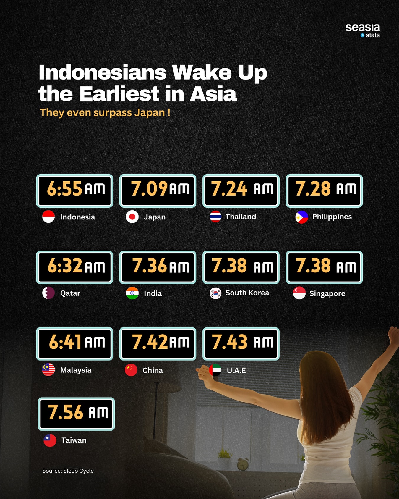 This early wake-up habit places Indonesia ahead of other Asian countries such as Japan, South Korea, and Singapore. Japan follows closely with an average wake-up time of 7:09 AM. Thailand and the Philippines also show a tendency towards later mornings, with average wake-up times of 7:24 AM and 7:28 AM, respectively.