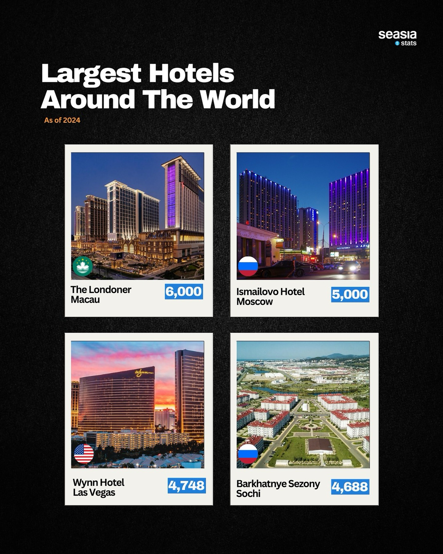 Another standout is The Londoner Macao, a hotel with 6,000 rooms that caters to visitors in the bustling region of Macau. Known for its mix of entertainment, luxury, and gambling, the Londoner Macao provides a high-end experience for its guests, offering everything from casino floors to Michelin-starred restaurants. Its size reflects the growing demand for premium accommodations in Asia's gaming capitals.