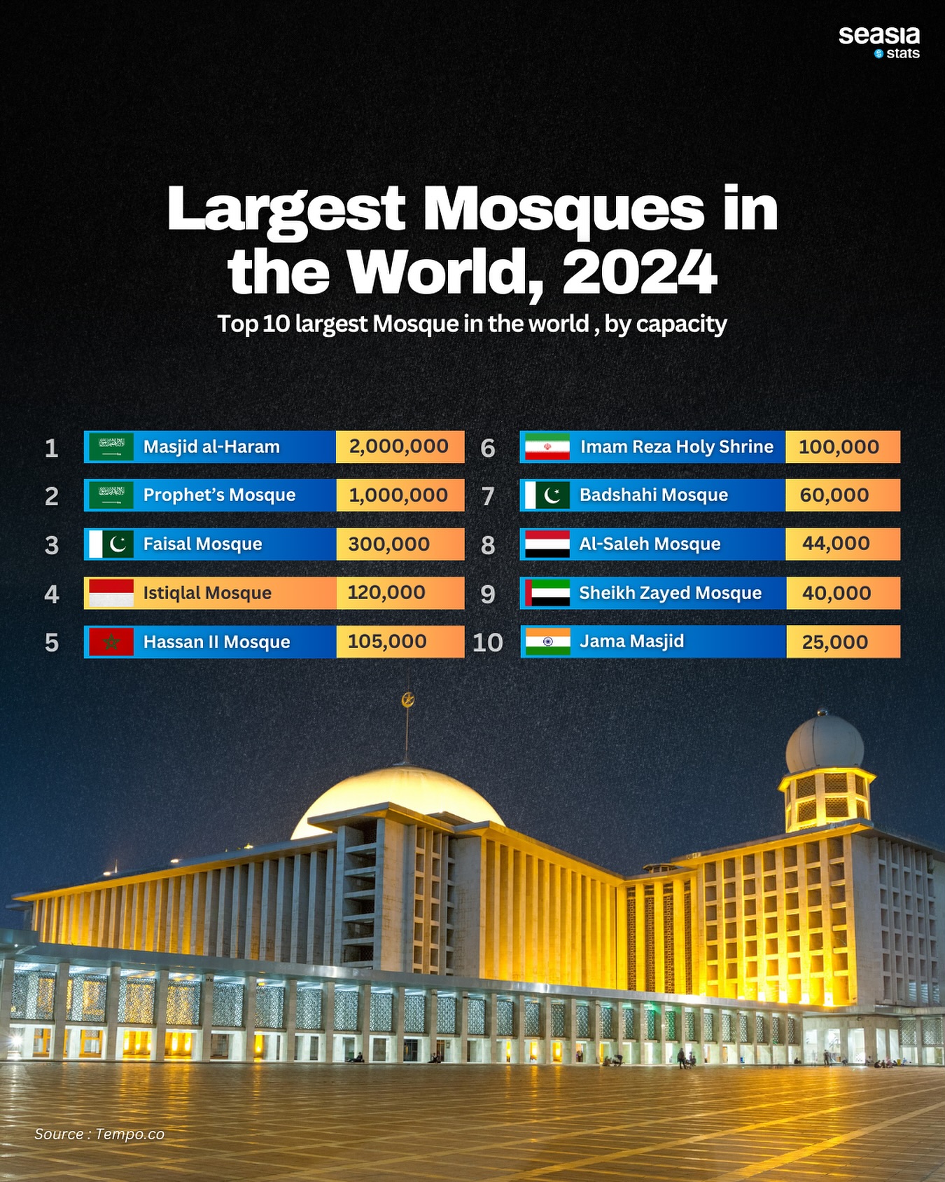 Based on data from Tempo.co which released data on the 10 largest mosques in the world in terms of capacity, they can accommodate 2,000,000 worshipers.