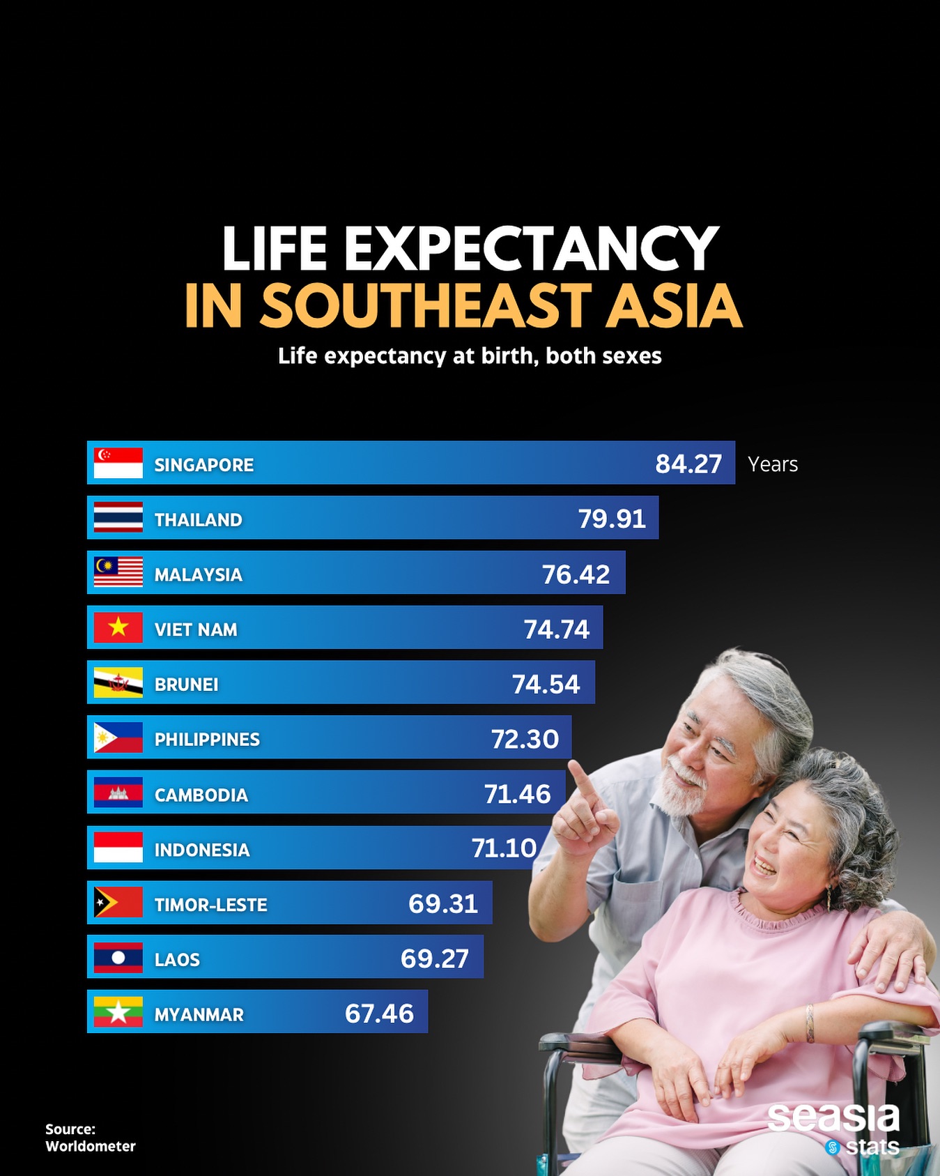 In the region, Singapore has the highest life expectancy at 84.27 years, while Myanmar has the lowest life expectancy at 67.46 years.