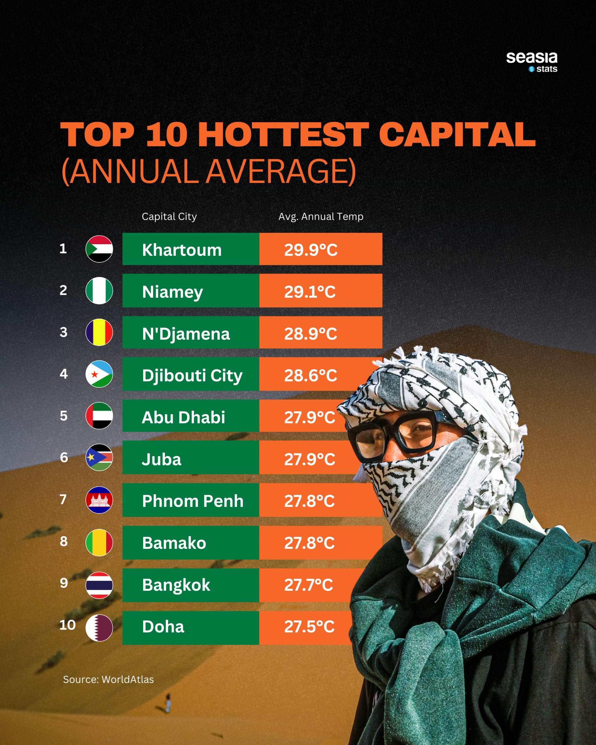 As global temperatures continue to rise, some cities feel the heat more than others—quite literally. A recent ranking compiled from WorldAtlas data and visualized by Seasia Stats highlights the top 10 hottest capital cities in the world by annual average temperature. Dominated by Africa and the Middle East, the list also includes Southeast Asian capitals where tropical climates and urban density keep temperatures consistently high year-round.