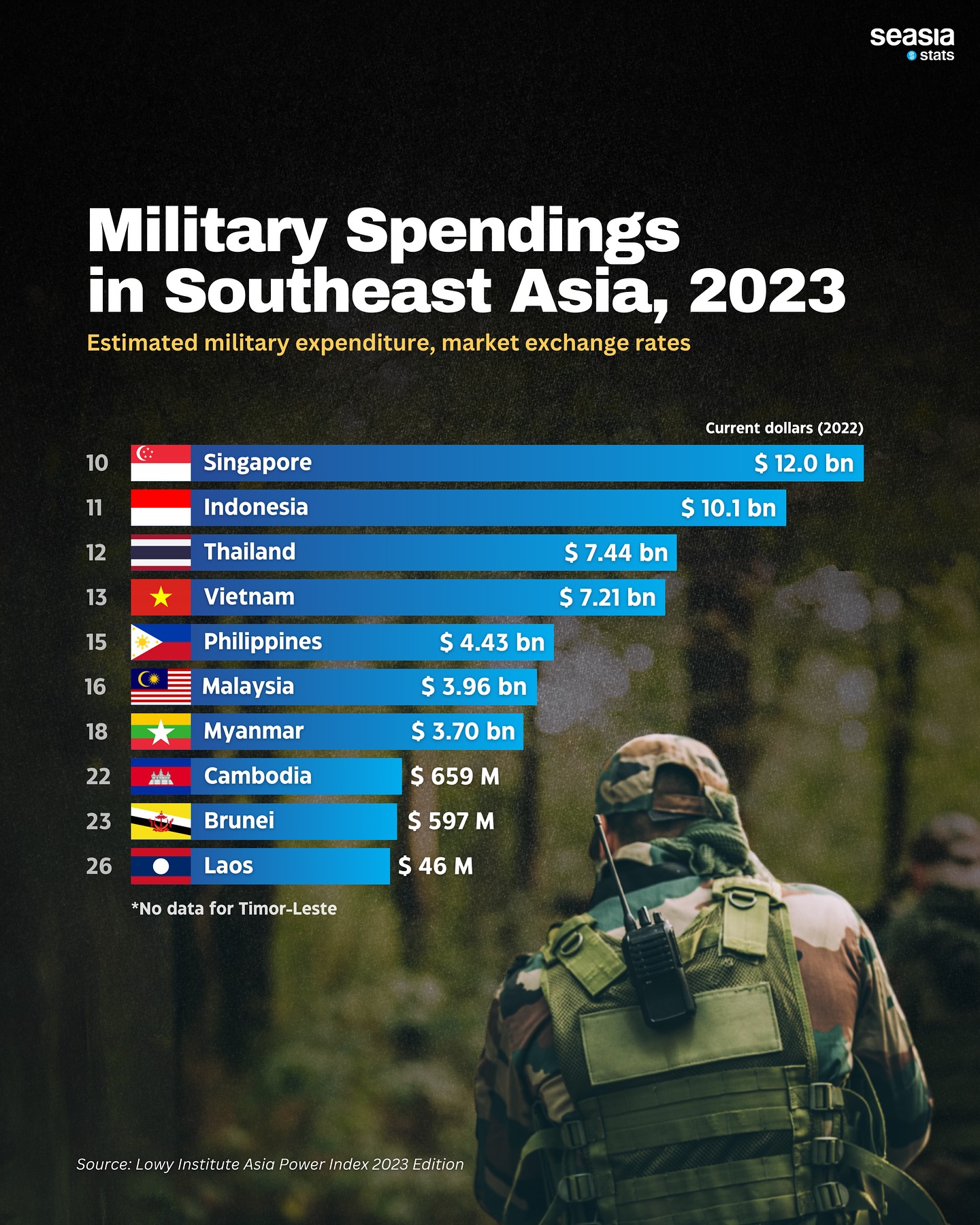 In 2023, Singapore emerged as the country with the highest military expenditure in Southeast Asia, totaling $12.0 billion, according to the Low Institute Asia Power Index 2023 Edition.