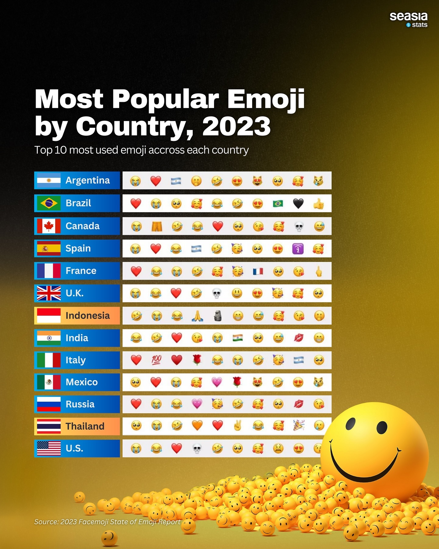 Indonesia and Thailand are included in the report published by the Facemoji State of Emoji Report for 2023. There are 13 countries in the world, each displaying their top 10 emojis (top 1 from left to right, top 10).