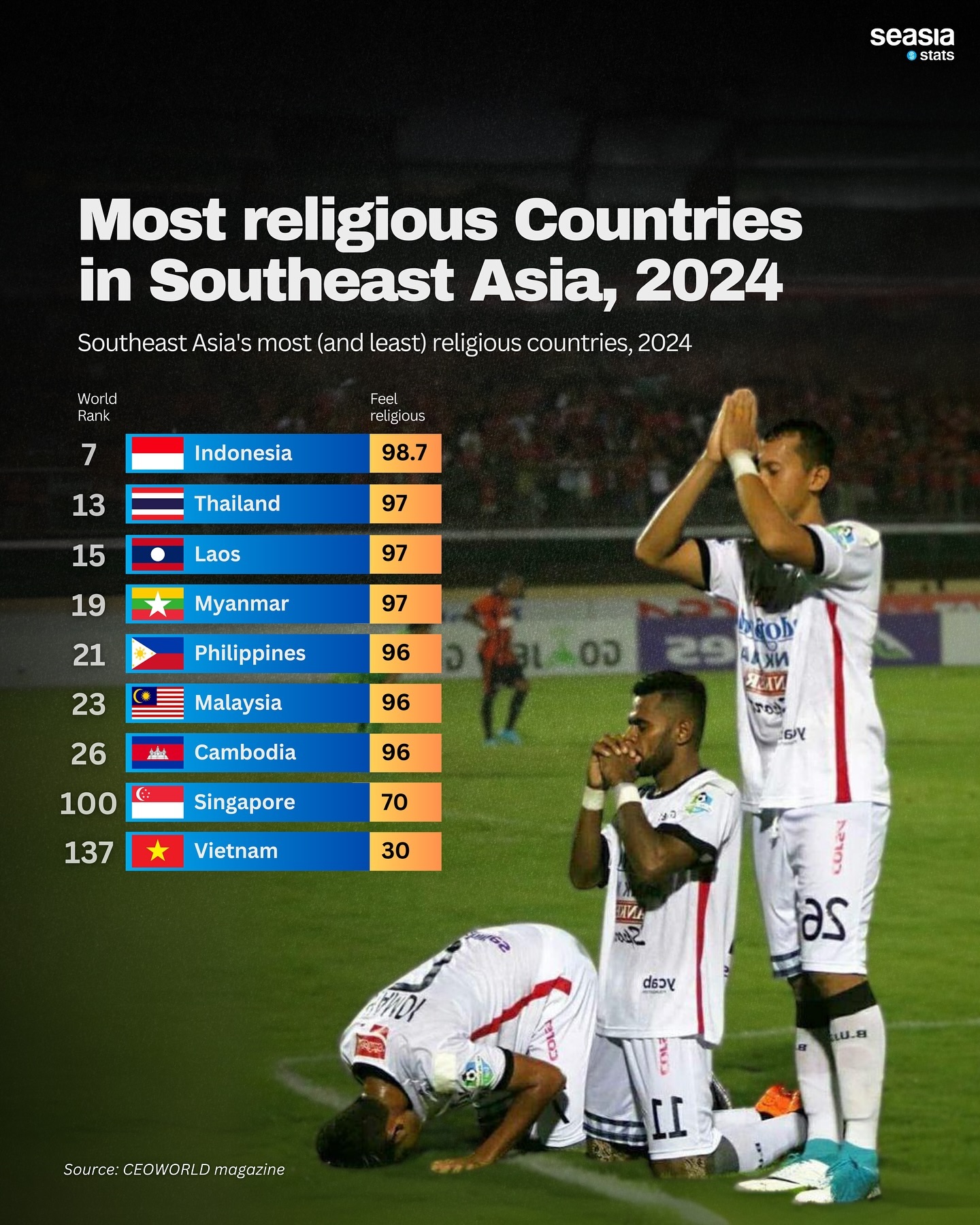 These rankings highlight the complexity of religious identities and practices within Southeast Asia, a region known for its cultural diversity and rich heritage. While Indonesia stands out for its devout religious adherence, Vietnam's position as the least religious country underscores the multifaceted nature of spirituality in the region.