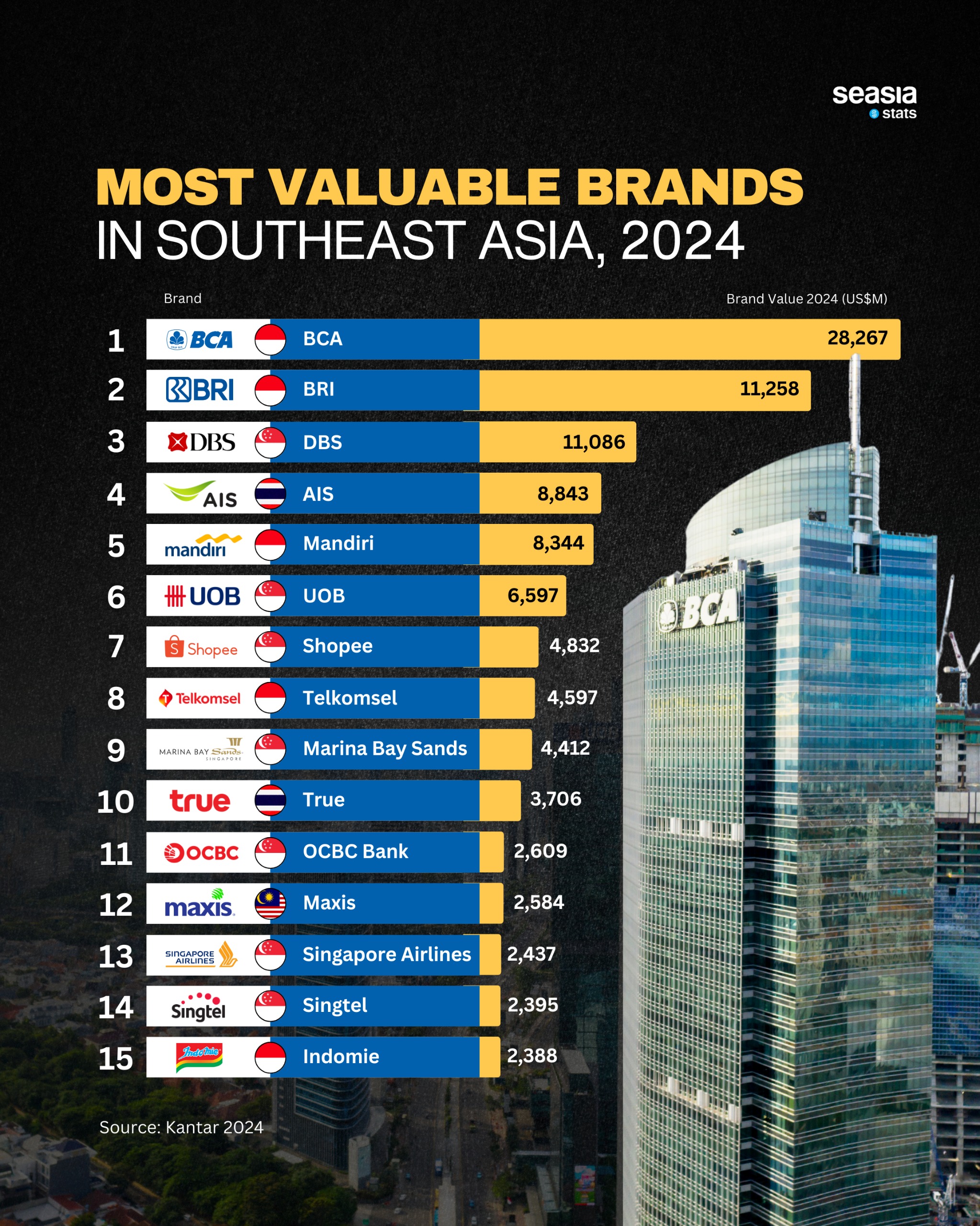 Indonesia dominates the top of the list, with four brands in the top six. This reflects not only the size of its domestic market but also its rising influence in Southeast Asia’s corporate scene.