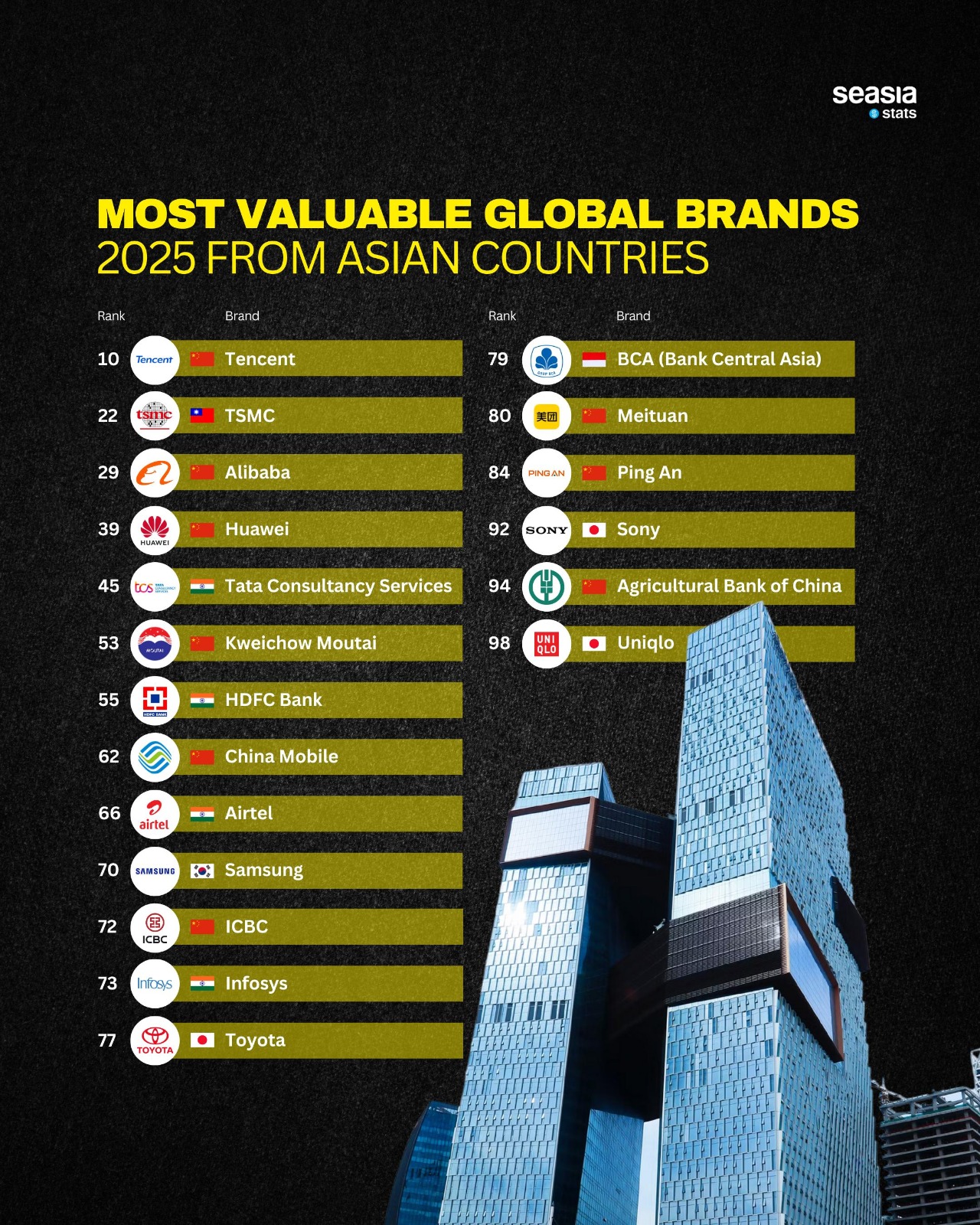 These companies signify East Asia’s continuing dominance in sectors like semiconductors, e-commerce, telecom, and cloud computing. With Huawei leading the charge in 5G technology and Alibaba at the forefront of online shopping, these brands reflect the region’s increasing control over the technologies that power modern economies.