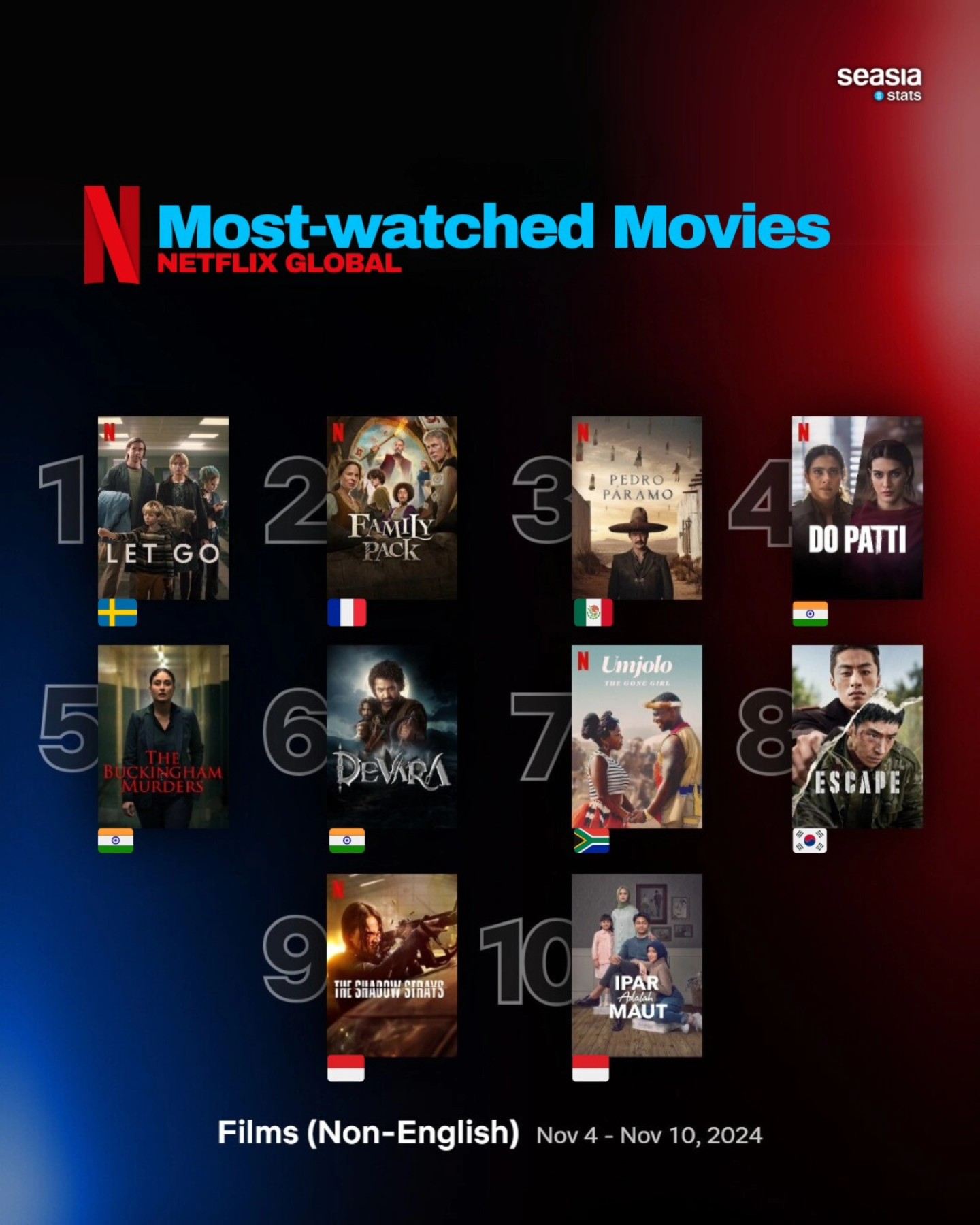 Another Indian production, Devara, ranks sixth. This film, with its compelling narrative and strong performances, highlights the diversity of themes explored in Indian cinema. Together, these films underscore the growing international appeal of Indian stories on Netflix, catering to both domestic audiences and global viewers.