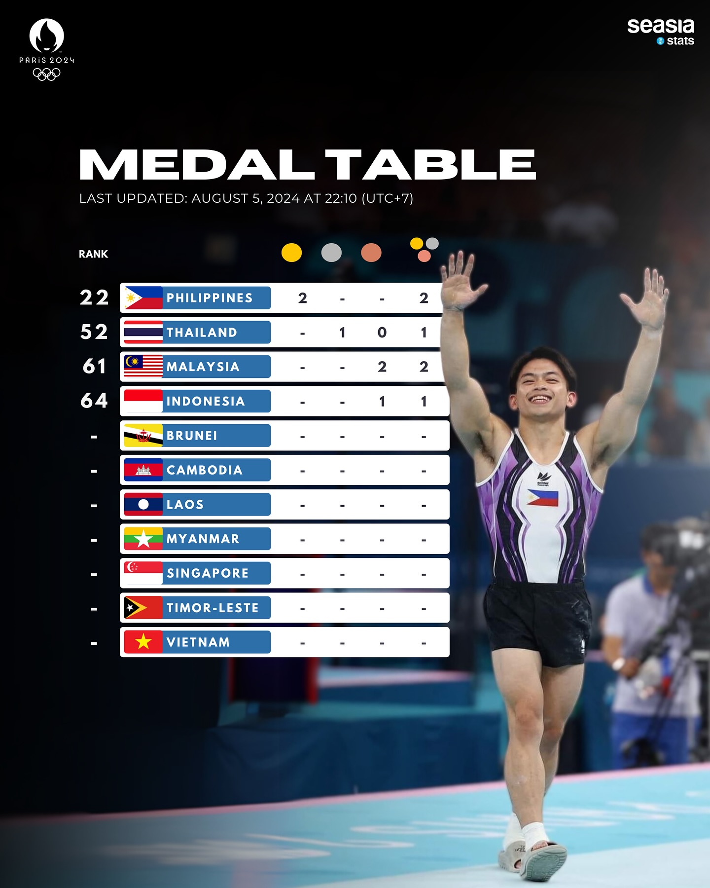 As the Paris 2024 Olympics continue, the Southeast Asian nations are making their mark on the medal tally. Here’s the current standings: