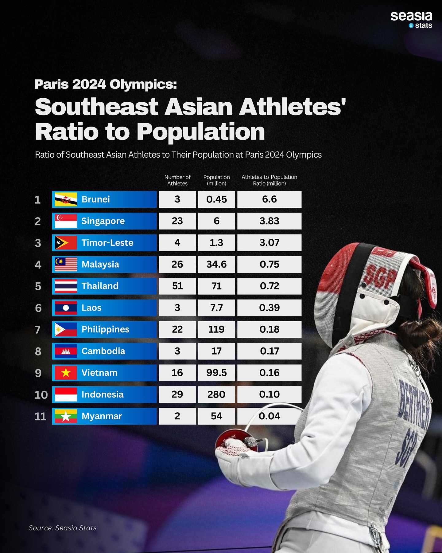 As the Paris 2024 Olympics progresses, an analysis of Southeast Asian nations' athlete-to-population ratios provides intriguing insights into the representation of these countries on the global stage. The ratio, which compares the number of athletes to the total population, reflects how each nation’s Olympic participation scales with its demographic size.