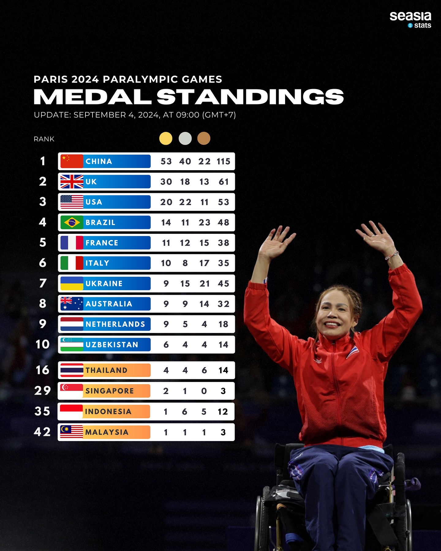 As of September 4, 2024, at 09:00 (GMT+7), Southeast Asian athletes are making their mark at the Paris 2024 Paralympic Games, with four countries achieving remarkable results on the global stage. Here's a breakdown of the medal standings for Southeast Asia: