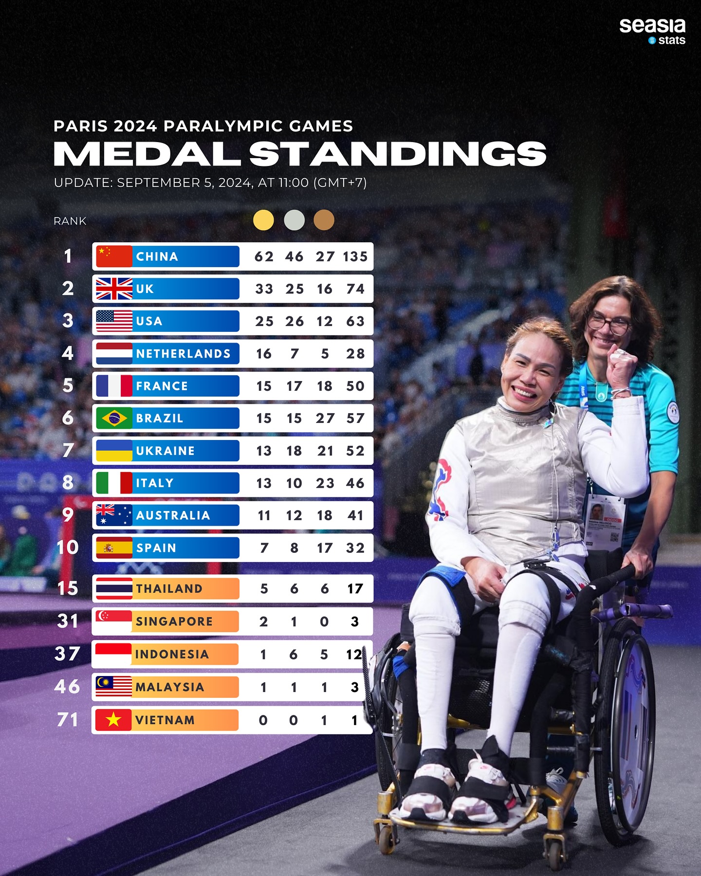 As of September 5, 2024, at 11:00 (GMT+7), five Southeast Asian nations have made their mark in the Paris 2024 Paralympic Games. With Thailand continuing to lead, the region is showing strong representation and resilience in the competition. Here's an update on the latest standings: