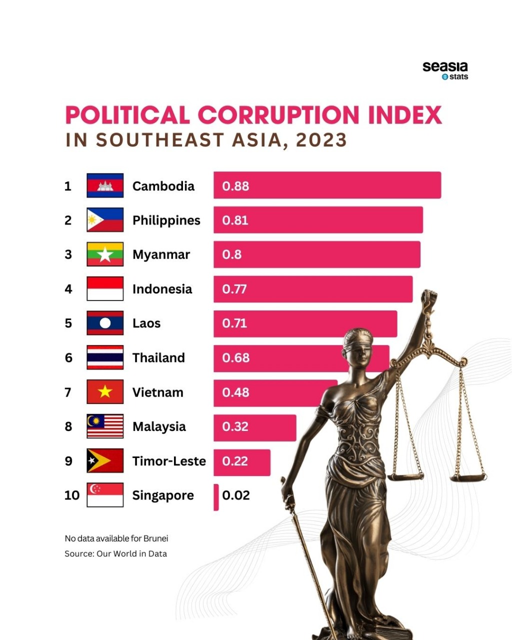The Political Corruption Index for Southeast Asia in 2023, sourced from Our World in Data and researched by the V-Dem Institute, provides insights into corruption levels across the region. The index ranges from 0 to 1, with higher scores indicating greater levels of perceived corruption.