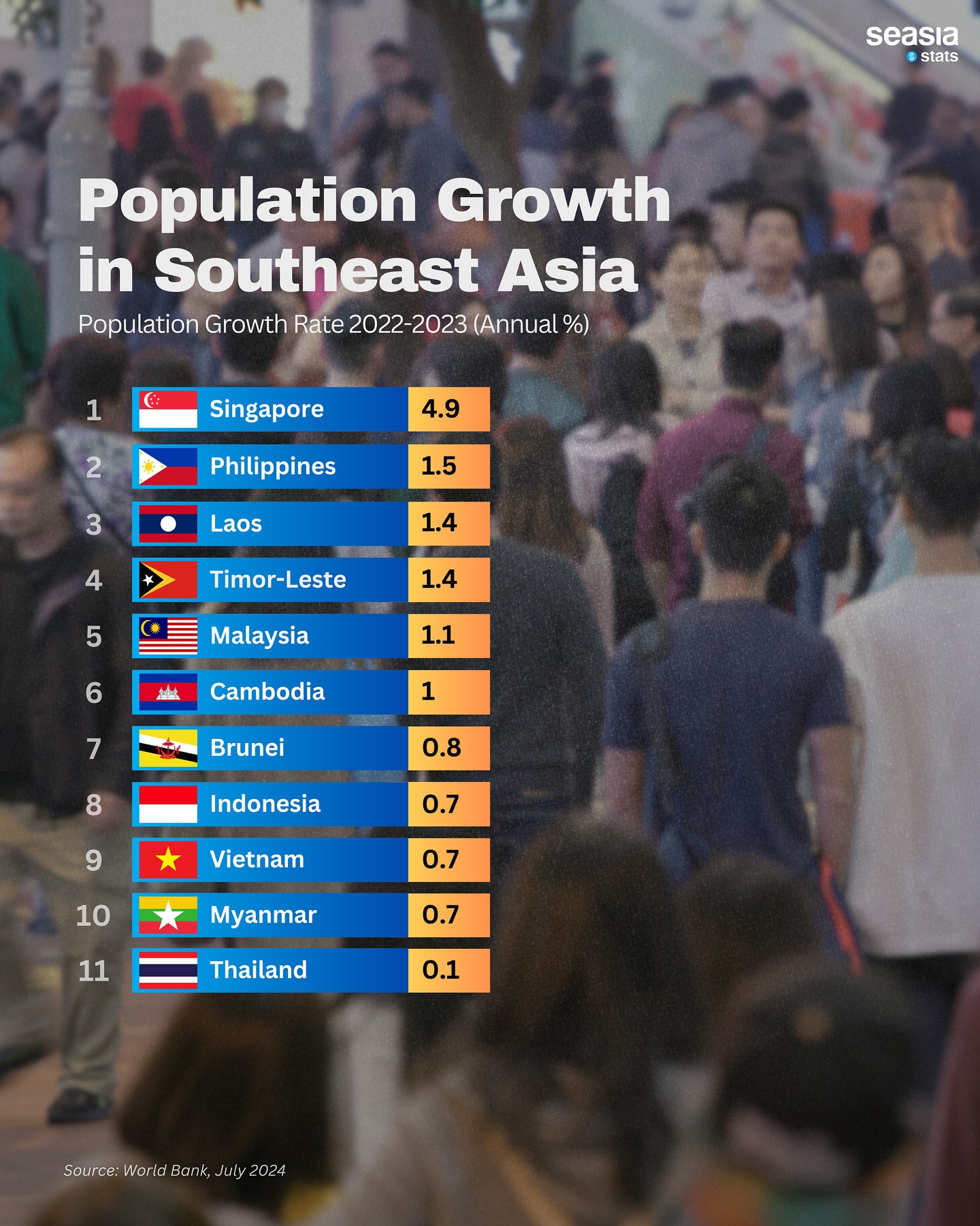 On the other end of the spectrum, Thailand experienced the slowest population growth rate in Southeast Asia, at just 0.1%. This minimal increase may reflect a range of factors, including lower birth rates and an aging population.