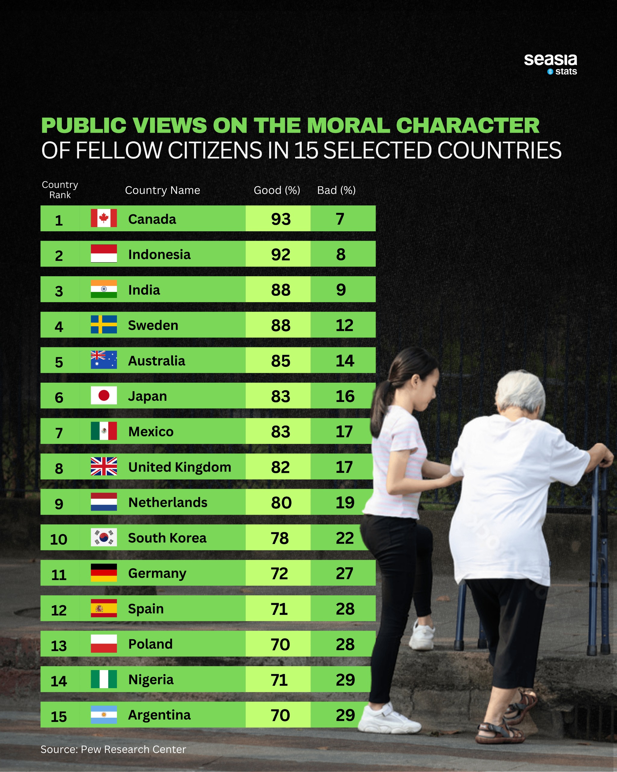Within Southeast Asia, Indonesia’s ranking is particularly notable. While many countries in the region emphasize strong community ties, large-scale survey data measuring public perceptions of moral character are relatively rare. Indonesia’s high score suggests a robust sense of social cohesion despite its vast geographic and cultural diversity.